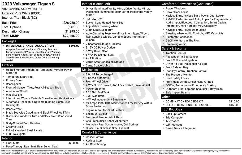 2023 Volkswagen Tiguan 2.0T S Certified. Pure White 2.0T S FWD 8-Speed Automatic with Tiptronic 2.0L TSI DOHC Volkswagen Certified, 3-Row Rubber Monster Mats w/Logo Kit (Set of 5), 3.33 Axle Ratio, 3rd row seats: bench, 4-Wheel Disc Brakes, 4-Wheel Independent Suspension, 6 Speakers, ABS brakes, Adaptive Cruise Control (ACC) Stop & Go, Air Conditioning, Alloy wheels, AM/FM radio, Auto-Dimming Interior Rear-View Mirror, Brake assist, Bumpers: body-color, Cloth Seating Surfaces, Compass, Convenience Features, Credit - Rear Sensors Removed, Delay-off headlights, Driver Assistance Package, Driver door bin, Driver vanity mirror, Dual front impact airbags, Dual front side impact airbags, Electronic Stability Control, Emergency Assist, Emergency communication system: VW Car-Net Safe & Secure 5-year, Exterior Parking Camera Rear, First Aid Kit, Forward collision: FCW w/Autonomous Emergency Braking mitigation, Four wheel independent suspension, Front anti-roll bar, Front Bucket Seats, Front Center Armrest, Front reading lights, Fully automatic headlights, Heated door mirrors, Heated Front Bucket Seats, Heated front seats, Heavy Duty Trunk Liner w/VW CarGo Blocks, Illuminated entry, Lane Assist (Lane Keeping System), Leather Shift Knob, Leatherette-Wrapped Steering Wheel, Low tire pressure warning, Occupant sensing airbag, Outside temperature display, Overhead airbag, Overhead console, Panic alarm, Passenger door bin, Passenger vanity mirror, Power door mirrors, Power steering, Power windows, Radio data system, Radio: Composition Color AM/FM, Rain-Sensing Automatic Front Wipers, Rear anti-roll bar, Rear reading lights, Rear seat center armrest, Rear window defroster, Rear window wiper, Remote keyless entry, Roadside Assistance Kit, Speed control, Speed-sensing steering, Split folding rear seat, Spoiler, Steering wheel mounted audio controls, Tachometer, Telescoping steering wheel, Tilt steering wheel, Traction control, Travel Assist (Semi-Automated Driving Assistance), Trip computer, Turn signal indicator mirrors, Variably intermittent wipers, Wheels: 17" 2-Tone Machined Twin 5-Spoke Alloy.