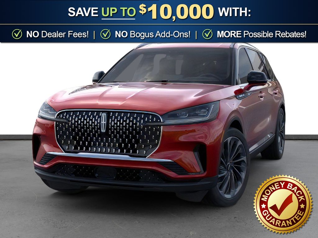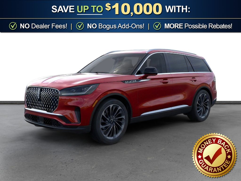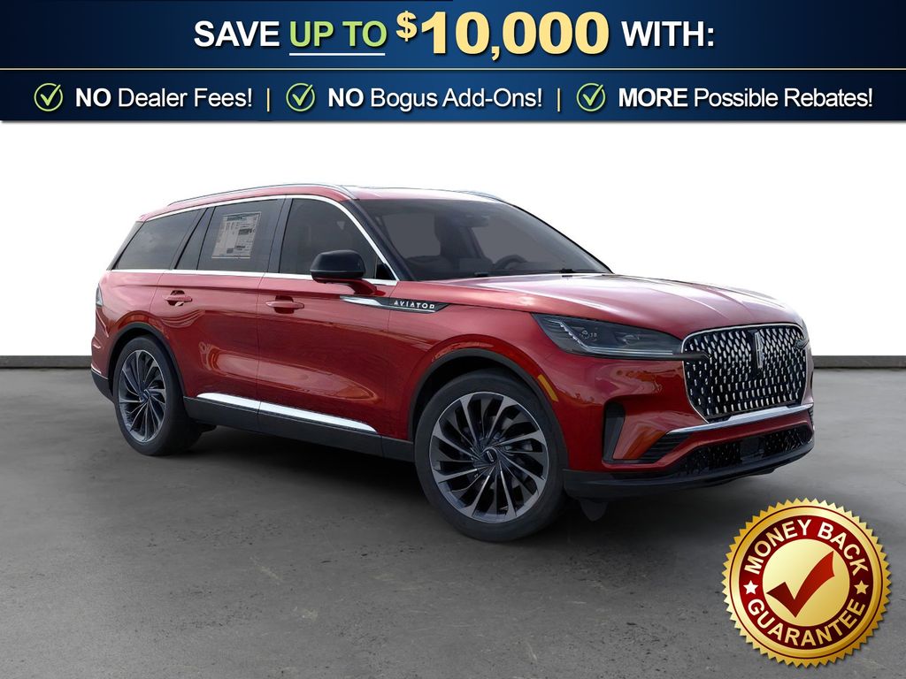 Red Carpet Tinted Clearcoat 2026 Lincoln Aviator Reserve NLT AWD 10-Speed Automatic 3.0L V6 14 Speakers, 2nd Row Bench Seat, 3rd row seats: split-bench, 4-Wheel Disc Brakes, 40/Mini Console/40 Dual Captain's Chairs, ABS brakes, Adaptive suspension, Air Conditioning, All-Weather 1st and 2nd Row Floor Liners, Alloy wheels, AM/FM radio: SiriusXM, Apple CarPlay/Android Auto, Audio memory, Auto Heated and Ventilated Driver and Passenger Seats, Auto High-beam Headlights, Auto-dimming door mirrors, Auto-dimming Rear-View mirror, Automatic temperature control, Brake assist, Bumpers: body-color, Compass, Delay-off headlights, Driver door bin, Driver vanity mirror, Dual front impact airbags, Dual front side impact airbags, Electronic Stability Control, Emergency communication system: 911 Assist, Four wheel independent suspension, Front anti-roll bar, Front Bucket Seats, Front Center Armrest, Front dual zone A/C, Front reading lights, Fully automatic headlights, Garage door transmitter, Genuine wood console insert, Genuine wood dashboard insert, Heads-Up Display, Heated door mirrors, Heated front seats, Heated steering wheel, HVAC memory, Illuminated entry, Knee airbag, Leather steering wheel, Lincoln App, Lincoln BlueCruise Equipped (4-Years Included), Lincoln Connectivity Package (4-Years), Lincoln Digital Experience, Low tire pressure warning, Memory seat, Navigation system: Google Maps, Occupant sensing airbag, Outside temperature display, Overhead airbag, Overhead console, Panic alarm, Passenger door bin, Passenger vanity mirror, Power door mirrors, Power driver seat, Power Liftgate, Power moonroof: Panoramic Vista Roof, Power passenger seat, Power steering, Power windows, Premium Leather Front Captain's Chairs, Radio data system, Radio: Revel Audio System with 14 Speakers, Rain sensing wipers, Rear air conditioning, Rear anti-roll bar, Rear audio controls, Rear dual zone A/C, Rear reading lights, Rear window defroster, Rear window wiper, Remote keyless entry, Security system, SiriusXM, Speed control, Speed-Sensitive Wipers, Split folding rear seat, Spoiler, Steering wheel memory, Steering wheel mounted A/C controls, Steering wheel mounted audio controls, Tachometer, Telescoping steering wheel, Tilt steering wheel, Traction control, Trip computer, Turn signal indicator mirrors, Variably intermittent wipers, Ventilated front seats, Wheels: 21" Bright-Machined Aluminum with Dark Alloy Painted Pockets, Wireless Charging Pad.