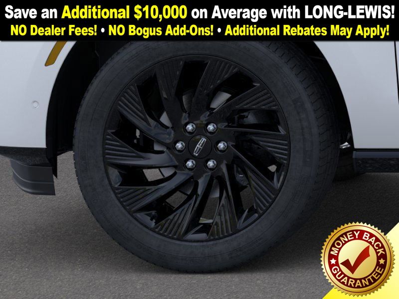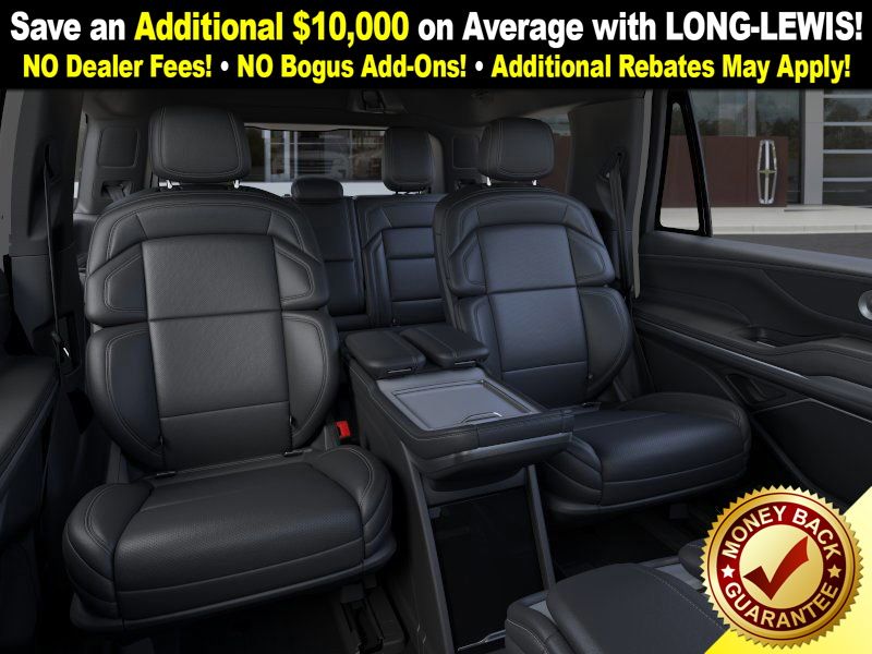 Heavy-Duty Trailer Tow Package (26mm Engine Radiator and Trailer Brake Controller), Jet Appearance Package (Black Accent Badge, Black Accent Interior Pack, Black Beltline Molding, Black Painted Roof Rails, Front Bumper Fascia, Lincoln Lit Star, Unique Lincoln Grille Pillar Black Surround, and Wheels: 22" High-Gloss Ebony Aluminum), Lincoln Connectivity Package (4-Years Included), Lincoln Security Package, 4WD, Black Onyx Prem Lthr Sur Leather, 28 Speakers, 2nd Row Heated & Ventilated Dual Captain's Chair, 3rd row seats: split-bench, 4-Wheel Disc Brakes, ABS brakes, Adaptive suspension, Air Conditioning, Alloy wheels, AM/FM radio: SiriusXM with 360L, Apple CarPlay/Android Auto, Audio memory, Auto Heated/Ventilated Premium Leather Captain's Chairs, Auto High-beam Headlights, Auto Start-Stop Technology, Auto tilt-away steering wheel, Auto-dimming door mirrors, Auto-dimming Rear-View mirror, Auto-leveling suspension, Automatic temperature control, Brake assist, Bumpers: body-color, Compass, Delay-off headlights, Driver door bin, Driver vanity mirror, Driver's Seat Mounted Armrest, Dual front impact airbags, Dual front side impact airbags, Electronic Stability Control, Emergency communication system: 911 Assist, Exterior Parking Camera Rear, Four wheel independent suspension, Front anti-roll bar, Front Bucket Seats, Front dual zone A/C, Front reading lights, Fully automatic headlights, Garage door transmitter, Heated door mirrors, Heated front seats, Heated rear seats, Heated steering wheel, HVAC memory, Illuminated entry, Leather steering wheel, Lincoln Connect, Lincoln Digital Experience, Low tire pressure warning, Memory seat, Navigation system: Connected Navigation (1-year trial), Occupant sensing airbag, Outside temperature display, Overhead airbag, Overhead console, Panic alarm, Passenger door bin, Passenger seat mounted armrest, Passenger vanity mirror, Power adjustable rear head restraints, Power door mirrors, Power driver seat, Power moonroof: Panoramic Vista Roof, Power passenger seat, Power steering, Power windows, Radio data system, Radio: Revel Ultima 3D Audio System, Rain sensing wipers, Rear air conditioning, Rear anti-roll bar, Rear audio controls, Rear reading lights, Rear window defroster, Rear window wiper, Reclining 3rd row seat, Remote keyless entry, Security system, SiriusXM with 360L (3 Months Trial), Speed control, Speed-sensing steering, Speed-Sensitive Wipers, Split folding rear seat, Spoiler, Steering wheel memory, Steering wheel mounted audio controls, Tachometer, Telescoping steering wheel, Tilt steering wheel, Traction control, Trip computer, Turn signal indicator mirrors, Variably intermittent wipers, Ventilated front seats, and Wheels: 22" Dark Tarnished Aluminum.