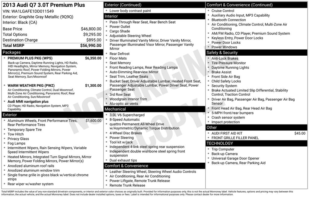 2013 Audi Q7 3.0T Premium quattro 3.0T Premium quattro quattro 8-Speed Automatic with Tiptronic 3.0L TFSI V6 DOHC 11 Speakers, 3.70 Axle Ratio, 3rd row seats: bench, 4-Wheel Disc Brakes, 6-Step Heated Front Bucket Seats, 8.0J x 18" 6-Arm-Design Wheels, ABS brakes, Air Conditioning, Alloy wheels, AM/FM radio: SiriusXM, Auto-dimming Rear-View mirror, Automatic temperature control, Brake assist, Bumpers: body-color, CD player, Compass, Delay-off headlights, Driver door bin, Driver vanity mirror, Driver's Seat Mounted Armrest, Dual front impact airbags, Dual front side impact airbags, Electronic Stability Control, Four wheel independent suspension, Front anti-roll bar, Front Bucket Seats, Front dual zone A/C, Front fog lights, Front reading lights, Fully automatic headlights, Garage door transmitter: HomeLink, Genuine wood console insert, Genuine wood dashboard insert, Genuine wood door panel insert, HD Radio, Heated door mirrors, Heated front seats, Illuminated entry, Leather Seating Surfaces, Leather Shift Knob, Leather steering wheel, Low tire pressure warning, Occupant sensing airbag, Outside temperature display, Overhead airbag, Overhead console, Panic alarm, Passenger door bin, Passenger seat mounted armrest, Passenger vanity mirror, Power door mirrors, Power driver seat, Power Liftgate, Power passenger seat, Power steering, Power windows, Radio data system, Radio: AM/FM/In-Dash Single CD Player, Rain sensing wipers, Rear anti-roll bar, Rear fog lights, Rear reading lights, Rear seat center armrest, Rear window defroster, Rear window wiper, Remote keyless entry, Roof rack: rails only, Security system, Speed control, Speed-sensing steering, Split folding rear seat, Spoiler, Steering wheel mounted audio controls, Tachometer, Telescoping steering wheel, Tilt steering wheel, Traction control, Trip computer, Turn signal indicator mirrors, Variably intermittent wipers.
