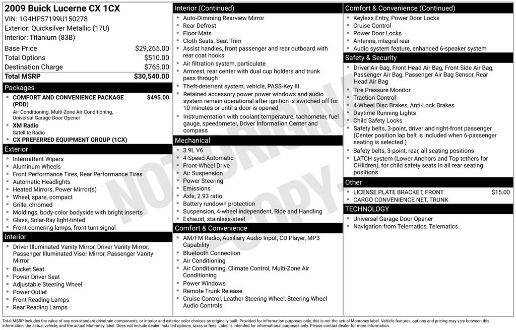 2009 Buick Lucerne CX Quicksilver Metallic CX FWD 4-Speed Automatic Electronic Enhanced 3.9L V6 SFI Titanium Cloth, 17" Bright Silver Finish Aluminum Wheels, 4-Wheel Disc Brakes, 5-Passenger Seating, 6 Speakers, ABS brakes, Air Conditioning, Alloy wheels, AM/FM radio: XM, AM/FM Stereo w/CD/MP3 Playback, Auto-dimming door mirrors, Auto-dimming Rear-View mirror, Auto-leveling suspension, Bodyside moldings, Bumpers: body-color, CD player, Cloth Seat Trim, Comfort & Convenience Package, Compass, Delay-off headlights, Driver door bin, Driver vanity mirror, Dual front impact airbags, Dual front side impact airbags, Dual-Zone Automatic Climate Control, Emergency communication system: OnStar Directions & Connections, Four wheel independent suspension, Front anti-roll bar, Front Bucket Seats, Front Center Armrest w/Storage, Front License Plate Bracket, Front reading lights, Fully automatic headlights, Heated door mirrors, Illuminated entry, Leather Shift Knob, Leather steering wheel, Low tire pressure warning, Occupant sensing airbag, Outside temperature display, Overhead airbag, Panic alarm, Passenger door bin, Passenger vanity mirror, Power door mirrors, Power driver seat, Power passenger seat, Power steering, Power windows, Preferred Equipment Group 1CX, Radio data system, Rear anti-roll bar, Rear reading lights, Rear seat center armrest, Rear window defroster, Remote keyless entry, Speed control, Steering wheel mounted audio controls, Tachometer, Tilt steering wheel, Traction control, Trip computer, Trunk Cargo Convenience Net, Universal Home Remote, Variably intermittent wipers, XM Radio, Titanium Cloth.