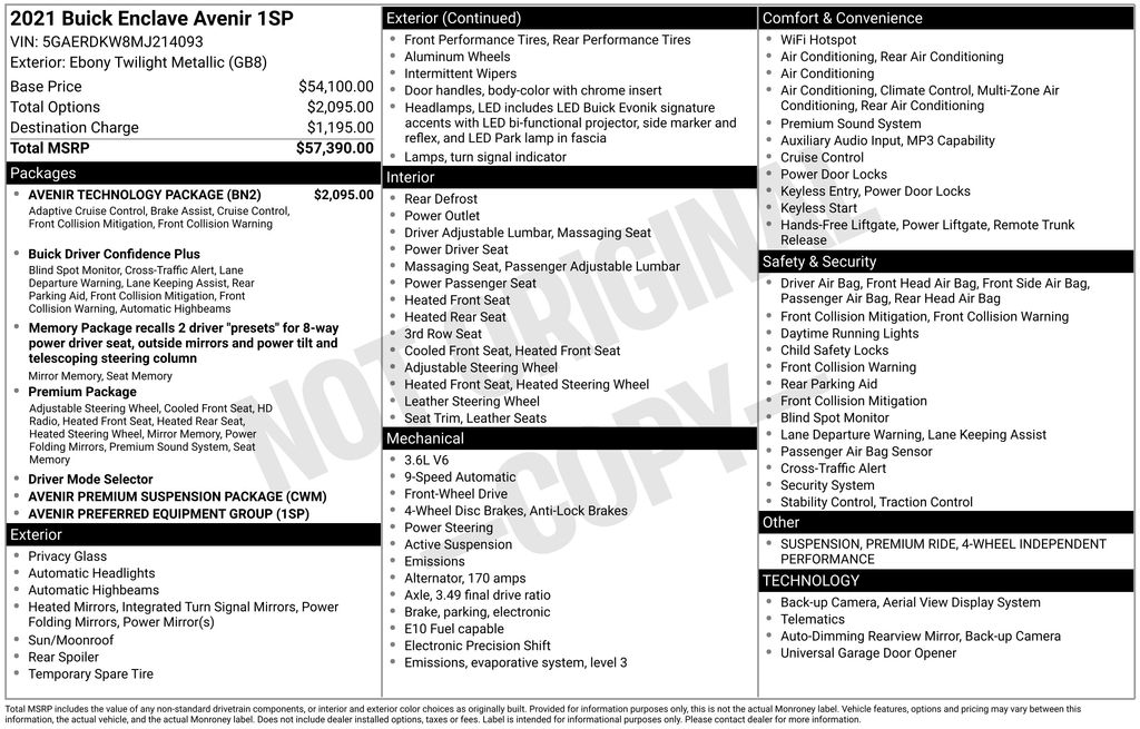 2021 Buick Enclave Avenir Ebony Twilight Metallic Avenir FWD 9-Speed Automatic 3.6L V6 SIDI VVT FWD, 10 Speakers, 120-Volt Power Outlet, 3.49 Axle Ratio, 3rd Row 60/40 Power Fold Split-Bench, 3rd row seats: split-bench, 4-Wheel Disc Brakes, 7-Passenger Seating, ABS brakes, Adaptive Cruise Control, Air Conditioning, Alloy wheels, AM/FM radio: SiriusXM with 360L, Apple CarPlay/Android Auto, Audio memory, Auto High-beam Headlights, Auto tilt-away steering wheel, Auto-dimming door mirrors, Auto-dimming Rear-View mirror, Automatic Heated Steering Wheel, Automatic temperature control, Avenir Package, Avenir Premium Suspension Package, Avenir Technology Package, Bose Performance-Enhanced 10-Speaker System, Brake assist, Bumpers: body-color, Chassis Continuously Variable Real Time Damping, Compass, Delay-off headlights, Driver 4-Way Power Lumbar Seat Adjuster, Driver door bin, Driver vanity mirror, Dual front impact airbags, Dual front side impact airbags, Electronic Stability Control, Emergency communication system: OnStar and Buick connected services capable, Enhanced Automatic Emergency Braking, Four wheel independent suspension, Front anti-roll bar, Front Bucket Seats, Front Center Armrest, Front dual zone A/C, Front Passenger 4-Way Power Lumbar Seat Adjuster, Front Power Sliding Moonroof, Front reading lights, Fully automatic headlights, Garage door transmitter, HD Radio, HD Surround Vision, Heated 2nd Row Outboard Seats, Heated door mirrors, Heated Driver & Front Passenger Seats, Heated front seats, Heated rear seats, Heated steering wheel, Illuminated entry, Inside Rearview Mirror w/Full Camera Display, Leather steering wheel, Low tire pressure warning, Memory Package, Memory seat, Navigation System, Occupant sensing airbag, Outside Heated Power-Adjustable Mirrors, Outside temperature display, Overhead airbag, Overhead console, Panic alarm, Passenger door bin, Passenger vanity mirror, Perforated Leather-Appointed Seat Trim, Power door mirrors, Power driver seat, Power Liftgate, Power moonroof, Power passenger seat, Power steering, Power Tilt & Telescopic Steering Column, Power windows, Preferred Equipment Group 1SP, Premium audio system: Buick Infotainment System, Premium Ride Suspension, Radio data system, Radio: Buick Infotainment Sys AM/FM Stereo w/Nav, Rear air conditioning, Rear anti-roll bar, Rear reading lights, Rear window defroster, Rear window wiper, Remote keyless entry, Roof rack: rails only, Security system, SiriusXM w/360L, Speed control, Speed-sensing steering, Spoiler, Steering wheel memory, Steering wheel mounted audio controls, Tachometer, Telescoping steering wheel, Tilt steering wheel, Traction control, Trip computer, Turn signal indicator mirrors, Variably intermittent wipers, Ventilated Driver & Front Passenger Seats, Ventilated front seats, Voltmeter, Wheels & Front Door Badging, Wheels: 20" Aluminum w/Premium Pearl Nickel Finish, Wireless Charging, FWD.