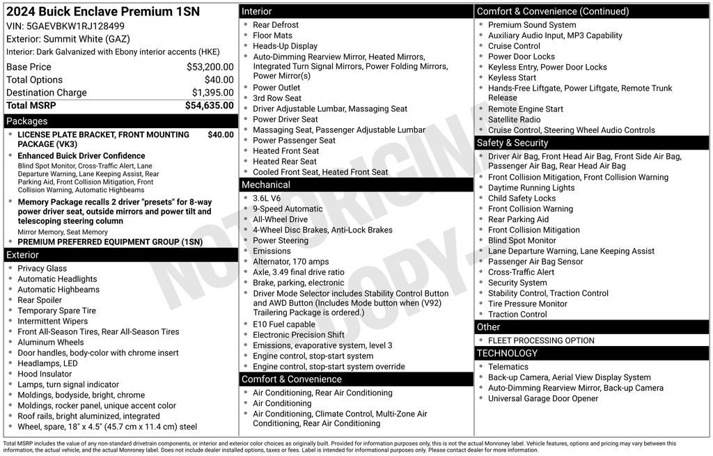 2024 Buick Enclave Premium Group Summit White Premium Group AWD 9-Speed Automatic 3.6L V6 SIDI VVT AWD, 10 Speakers, 18" Aluminum Wheels, 3.49 Final Drive Axle Ratio, 3rd row seats: split-bench, 4-Wheel Disc Brakes, 6-Way Power Front Passenger Seat Adjuster, 7-Passenger Seating, 8-Way Power Driver Seat Adjuster, ABS brakes, Air Conditioning, Alloy wheels, AM/FM radio: SiriusXM with 360L, Auto High-beam Headlights, Auto-dimming door mirrors, Auto-dimming Rear-View mirror, Automatic temperature control, Bose Performance-Enhanced 10-Speaker System, Brake assist, Bumpers: body-color, Compass, Delay-off headlights, Driver 4-Way Power Lumbar Seat Adjuster, Driver door bin, Driver vanity mirror, Dual front impact airbags, Dual front side impact airbags, Electronic Stability Control, Emergency communication system: OnStar and Buick connected services capable, Exterior Parking Camera Rear, Four wheel independent suspension, Front anti-roll bar, Front Bucket Seats, Front Center Armrest, Front dual zone A/C, Front Mounting License Plate Bracket Package, Front Passenger 4-Way Power Lumbar Seat Adjuster, Front reading lights, Fully automatic headlights, Garage door transmitter, Heads-Up Display, Heated door mirrors, Heated Driver & Front Passenger Seats, Heated front seats, Heated rear seats, Heated steering wheel, Illuminated entry, Leather steering wheel, Low tire pressure warning, Memory seat, Navigation System, Occupant sensing airbag, Outside temperature display, Overhead airbag, Overhead console, Panic alarm, Passenger door bin, Passenger vanity mirror, Perforated Leather-Appointed Seat Trim, Power door mirrors, Power driver seat, Power Liftgate, Power passenger seat, Power steering, Power windows, Preferred Equipment Group 1SN, Premium audio system: Buick Infotainment System, Radio data system, Radio: Buick Infotainment Sys AM/FM Stereo w/Nav, Rear air conditioning, Rear anti-roll bar, Rear reading lights, Rear window defroster, Rear window wiper, Remote keyless entry, Security system, SiriusXM w/360L, Speed control, Speed-sensing steering, Spoiler, Steering wheel memory, Steering wheel mounted audio controls, Tachometer, Telescoping steering wheel, Tilt steering wheel, Traction control, Trip computer, Turn signal indicator mirrors, Variably intermittent wipers, Vehicle Health Management, Ventilated Driver & Front Passenger Seats, Ventilated front seats, Voltmeter, Wireless Apple CarPlay/Wireless Android Auto, AWD.