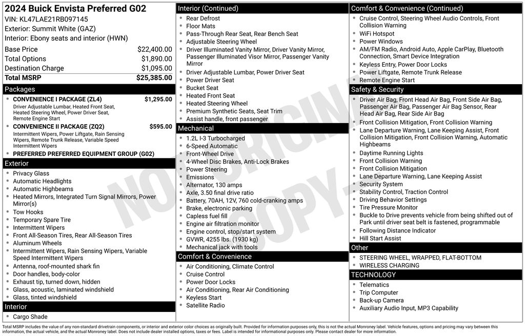 2024 Buick Envista Preferred Summit White Preferred FWD 6-Speed Automatic ECOTEC 1.2L Turbo 2 USB Ports (1 Type-A, 1 Type-C), 2-Way Power Driver Lumbar Control, 3.50 Final Drive Axle Ratio, 4-Way Manual Passenger Seat Adjuster, 4-Wheel Disc Brakes, 6 Speakers, 6-Way Manual Driver Seat Adjuster, 8-Way Power Driver Seat Adjuster, ABS brakes, Air Conditioning, Alloy wheels, AM/FM radio: SiriusXM, Auto High-beam Headlights, Automatic temperature control, Brake assist, Bumpers: body-color, Cloth w/Leatherette Seat Trim, Compass, Convenience I Package, Convenience II Package, Delay-off headlights, Driver door bin, Driver vanity mirror, Dual front impact airbags, Dual front side impact airbags, Electronic Stability Control, Emergency communication system: OnStar, Exterior Parking Camera Rear, Flat-Bottom Wrapped Steering Wheel, Front anti-roll bar, Front Bucket Seats, Front Center Armrest, Front Doors Keyless Open, Front Intermittent Rainsense Wipers, Front reading lights, Front wheel independent suspension, Fully automatic headlights, Heated door mirrors, Heated Driver & Front Passenger Seats, Heated Steering Wheel, Illuminated entry, Low tire pressure warning, Occupant sensing airbag, Outside temperature display, Overhead airbag, Overhead console, Panic alarm, Passenger door bin, Passenger vanity mirror, Power door mirrors, Power Liftgate, Power steering, Power windows, Preferred Equipment Group G02, Premium 6-Speaker Audio System Feature, Radio data system, Radio: AM/FM Stereo Audio System, Rear window defroster, Remote keyless entry, Remote Vehicle Starter System, Security system, SiriusXM, Speed control, Split folding rear seat, Steering wheel mounted audio controls, Tachometer, Telescoping steering wheel, Tilt steering wheel, Traction control, Trip computer, Turn signal indicator mirrors, Variably intermittent wipers, Wheels: 17" Bright Silver Painted Aluminum, Wireless Apple CarPlay/Wireless Android Auto, Wireless Charging.