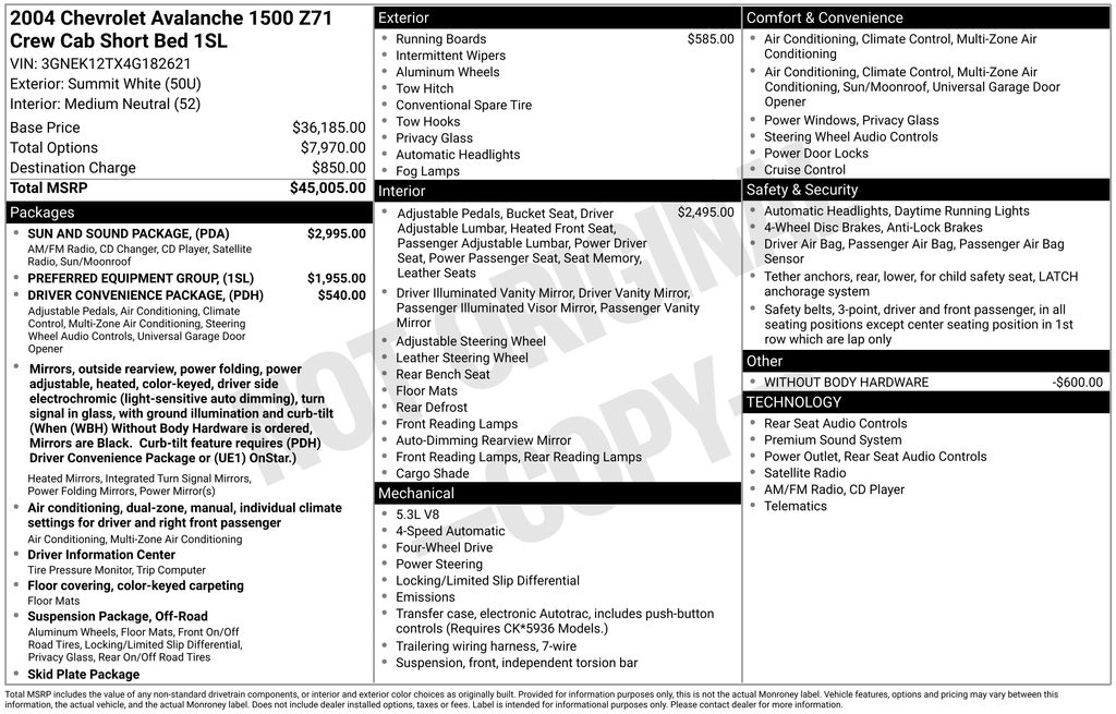 2004 Chevrolet Avalanche 1500 Base Olympic White 4WD 4-Speed Automatic with Overdrive Vortec 5.3L V8 SFI 4WD, 16" x 7" Aluminum Wheels, 17" x 7" Aluminum Wheels, 4-Wheel Disc Brakes, 40/20/40 Front Split-Bench Seat, 6 Speakers, ABS brakes, Air Conditioning, Alloy wheels, AM/FM radio, Auto-dimming Rear-View mirror, Automatic Dual-Zone Climate Control, Black Door Handles, Black Power Adjust Heated Outside Rear-View Mirrors, CD player, Chrome Front & Rear Bumpers, Compass, Custom Cloth Seat Trim w/Insert, Driver Convenience Package, Driver door bin, Driver vanity mirror, Dual front impact airbags, Electric Power Tilt-Sliding Sunroof, Floor Console, Front anti-roll bar, Front Center Armrest w/Storage, Front dual zone A/C, Front fog lights, Front Power Reclining Full-Feature Bucket Seats, Front reading lights, Front wheel independent suspension, Fully automatic headlights, Heated door mirrors, Heavy-Duty Rear Locking Differential, Heavy-Duty Trailering Equipment, HomeLink Wireless Control System, Illuminated entry, Integrated 2nd Row Audio Controls, Leather steering wheel, Manual Dual-Zone Air Conditioning, Occupant sensing airbag, Off Road Package, Off-Road Suspension Package, OnStar 1-Year Safe & Sound Service, Outside temperature display, Overhead console, Panic alarm, Passenger door bin, Passenger vanity mirror, Power Adjustable Pedals, Power door mirrors, Power driver seat, Power Folding Heated Outside Rear-View Mirrors, Power steering, Power windows, Radio data system, Rear anti-roll bar, Rear reading lights, Rear Seat Audio Controls w/Headphone Jacks, Rear seat center armrest, Rear step bumper, Rear window defroster, Remote keyless entry, Security system, Skid Plate Package, Smooth Ride Suspension Package, Solar-Ray Deep Tinted Back Glass, Speed control, Split folding rear seat, Stainless Steel Tubular Assist Steps, Steering Wheel Mounted Radio Controls, Sun & Sound Package, Tachometer, Tilt steering wheel, Unique Removable Black Rubberized Vinyl Floormats, Variably intermittent wipers, Voltmeter, Without Body Hardware, 4WD.