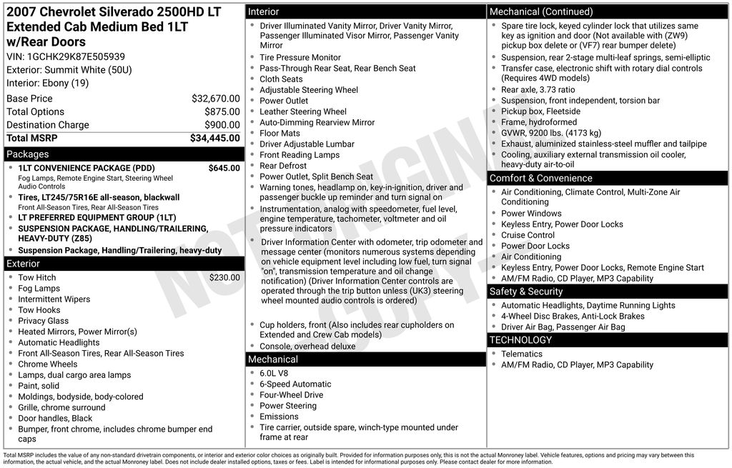 2007 Chevrolet Silverado 2500HD LT LT1 Summit White LT LT1 4WD 6-Speed Automatic HD Electronic with Overdrive Vortec 6.0L V8 SFI VVT 6-Speed Automatic HD Electronic with Overdrive, 4WD, Ebony Cloth, 3.73 Rear Axle Ratio, 4-Wheel Disc Brakes, ABS brakes, Air Conditioning, AM/FM radio, Bumpers: chrome, Color-Keyed Carpeted Floor Covering, Delay-off headlights, Driver door bin, Dual front impact airbags, Electric Rear-Window Defogger, Electronic Cruise Control w/Set & Resume Speed, Emergency communication system: OnStar, Front anti-roll bar, Front Center Armrest w/Storage, Front reading lights, Front wheel independent suspension, Fully automatic headlights, Heavy-Duty Handling/Trailering Suspension Package, Heavy-Duty Rear Automatic Locking Differential, Heavy-Duty Trailering Equipment, Low tire pressure warning, Overhead console, Passenger cancellable airbag, Passenger door bin, Passenger vanity mirror, Power Door Locks, Power steering, Rear reading lights, Rear step bumper, Solar-Ray Deep-Tinted Glass, Spare Tire Lock, Tachometer, Tilt steering wheel, Variably intermittent wipers, Voltmeter, 6-Speed Automatic HD Electronic with Overdrive, 4WD, Ebony Cloth.