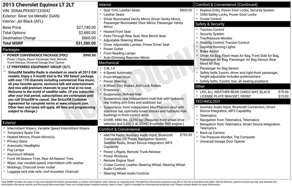 17" Aluminum Wheels, 3.23 Axle Ratio, 4-Wheel Disc Brakes, 8 Speakers, 8-Way Power Driver Seat Adjuster, 8-Way Power Front Passenger Seat Adjuster, ABS brakes, Air Conditioning, Alloy wheels, AM/FM radio: SiriusXM, Auto-dimming Rear-View mirror, Automatic Climate Control, Automatic temperature control, Black All-Weather Rear Cargo Mat (LPO), Bluetooth® For Phone, Brake assist, Bumpers: body-color, CD player, Chevrolet MyLink Touch, Compass, Delay-off headlights, Deluxe Front Bucket Seats, Driver door bin, Driver vanity mirror, Dual front impact airbags, Dual front side impact airbags, Electronic Stability Control, Emergency communication system: OnStar Directions & Connections, Equipment Group 2LT, Exterior Parking Camera Rear, Four wheel independent suspension, Front anti-roll bar, Front Bucket Seats, Front Center Armrest, Front fog lights, Front Halogen Fog Lamps, Front License Plate Bracket, Front reading lights, Fully automatic headlights, Heated door mirrors, Heated Driver & Front Passenger Seats, Heated front seats, Illuminated entry, Inside Self-Dimming Rear-View Mirror, Low tire pressure warning, Occupant sensing airbag, Outside temperature display, Overhead airbag, Panic alarm, Passenger door bin, Passenger vanity mirror, Perforated Leather-Appointed Seat Trim, Pioneer Premium 8-Speaker System, Power Convenience Package, Power door mirrors, Power driver seat, Power Programmable Rear Liftgate, Power steering, Power windows, Premium Cloth Seat Trim, Radio data system, Radio: AM/FM Stereo w/CD/MP3/Touch-Screen Display, Radio: Chevrolet MyLink Audio System w/Navigation, Rear anti-roll bar, Rear seat center armrest, Rear window defroster, Rear window wiper, Remote keyless entry, Remote Vehicle Starter System, Roof rack: rails only, Security system, SIRIUSXM Satellite Radio, Speed control, Speed-sensing steering, Split folding rear seat, Spoiler, Steering wheel mounted audio controls, Tachometer, Telescoping steering wheel, Tilt steering wheel, Traction control, Trip computer, Universal Home Remote, Variably intermittent wipers.