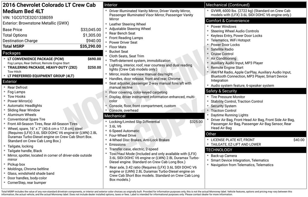 2016 Chevrolet Colorado LT **Here at Long-Lewis we believe in being transparent. We have no Doc fees, or any other hidden fees. We are a one price store and give our best price up front and they are clearly marked on all our inventory.** Brownstone Metallic 4WD 6-Speed Automatic 3.6L V6 DGI DOHC VVT 4WD.