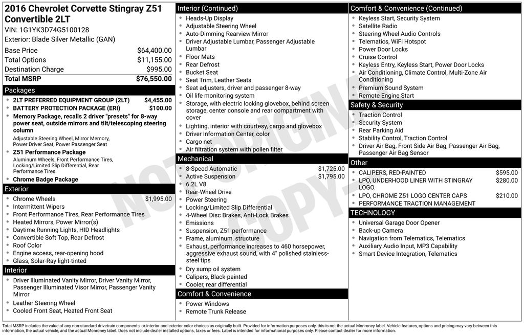 2.73 Limited Slip Performance Rear Axle Ratio, 2LT Interior Trim, 4-Wheel Disc Brakes, 8-Way Driver & Passenger Seat Adjusters, 9 Speakers, ABS brakes, Air Conditioning, Alloy wheels, AM/FM radio: SiriusXM, Auto-Dimming Inside Frameless Rearview Mirror, Automatic temperature control, Battery Protection Package, Body-Color Outside Heated Power-Adjustable Mirrors, Bose Advanced 10-Speaker Audio System Feature, Bose Premium 9-Speaker Audio System Feature, Bumpers: body-color, Cargo Net, Chrome Z51 Logo Center Caps (LPO), Compass, Convertible roof lining, Delay-off headlights, Driver door bin, Driver vanity mirror, Dual front impact airbags, Dual front side impact airbags, Electronic Stability Control, Emergency communication system, Exterior Parking Camera Rear, Four wheel independent suspension, Front anti-roll bar, Front Bucket Seats, Front Center Armrest, Front Curb View Cameras, Front dual zone A/C, Front reading lights, Fully automatic headlights, Glass rear window, GT Bucket Seats, Head-Up Display, Heated & Vented Driver & Passenger Seats, Heated door mirrors, High-Intensity Discharge Headlights, Illuminated entry, Leather Shift Knob, Leather steering wheel, Low tire pressure warning, Magnetic Selective Ride Control, Memory Package, MP3 decoder, Occupant sensing airbag, Outside temperature display, Panic alarm, Passenger door bin, Passenger vanity mirror, Performance Traction Management, Power convertible roof, Power door mirrors, Power driver seat, Power Lumbar/Bolster Seat Adjusters, Power passenger seat, Power steering, Power windows, Preferred Equipment Group 2LT, Premium audio system: Chevrolet MyLink, Radio data system, Radio: Chevrolet MyLink Audio System, Rear anti-roll bar, Rear window defroster, Red Painted Calipers, Remote keyless entry, Remote Vehicle Starter System, Speed control, Speed-sensing steering, Spoiler, Sport steering wheel, Steering wheel mounted audio controls, Tachometer, Telescoping steering wheel, Theft Deterrent System, Tilt steering wheel, Traction control, Trip computer, Underhood Liner w/Stingray Logo (LPO), Universal Home Remote, Variably intermittent wipers, Voltmeter, Wheels: 19" x 8.5" Fr & 20" x 10" Rr 5-Split Spoke, Wheels: 19" x 8.5" Fr & 20" x 10" Rr Chrome Alum..