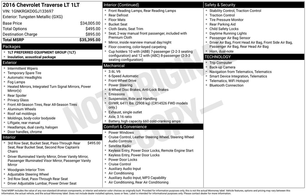 2016 Chevrolet Traverse LT 1LT Gray LT 1LT FWD 6-Speed Automatic 3.6L V6 SIDI 18" x 7.5" Machined Aluminum Wheels, 3.16 Axle Ratio, 3rd row seats: split-bench, 4-Wheel Disc Brakes, 6 Speakers, 8-Passenger Seating (2-3-3 Seating Configuration), 8-Way Power Driver Seat w/Power Lumbar, ABS brakes, Air Conditioning, Alloy wheels, AM/FM radio: SiriusXM, Bluetooth® For Phone, Body-Color Bodyside Moldings, Body-Color Heated Power-Adjustable Outside Mirrors, Bodyside moldings, Brake assist, Bumpers: body-color, CD player, Compass, Delay-off headlights, Driver door bin, Driver vanity mirror, Dual front impact airbags, Dual front side impact airbags, Electronic Stability Control, Emergency communication system: OnStar, Enhanced Driver Information Center, Exterior Parking Camera Rear, Four wheel independent suspension, Front anti-roll bar, Front Bucket Seats, Front Center Armrest w/Storage, Front Fog Lamps, Front fog lights, Front reading lights, Frontal & Side-Impact Airbags, Fully automatic headlights, Heated door mirrors, Illuminated entry, Interior Wood Grain Center Stack & Interior Trim, Leather-Wrapped Steering Wheel, Low tire pressure warning, Occupant sensing airbag, Outside temperature display, Overhead airbag, Panic alarm, Passenger door bin, Passenger vanity mirror, Power door mirrors, Power driver seat, Power steering, Power windows, Premium Cloth Seat Trim, Radio data system, Radio: Color Touch AM/FM/SiriusXM/CD Player, Rear air conditioning, Rear anti-roll bar, Rear Park Assist, Rear reading lights, Rear seat center armrest, Rear window defroster, Rear window wiper, Remote keyless entry, Remote Vehicle Start, Roof rack: rails only, Security system, SiriusXM Satellite Radio, Speed control, Split folding rear seat, Spoiler, Standard Speaker System, Steering wheel mounted audio controls, Tachometer, Telescoping steering wheel, Tilt steering wheel, Traction control, Trip computer, Turn signal indicator mirrors, Variably intermittent wipers, Voltmeter.