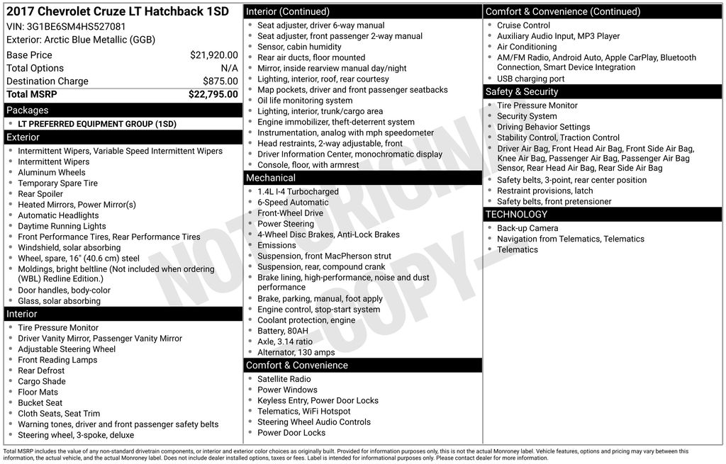 These figures are for the regular gasoline-powered 1.4-liter turbo engines most 2017 Cruzes come with pretty good for non-hybrid compact cars.