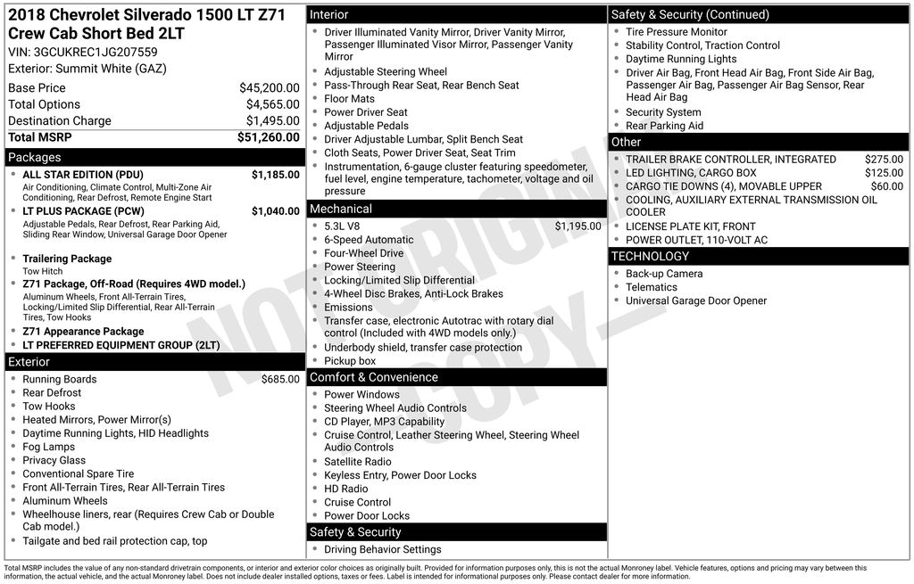 2018 Chevrolet Silverado 1500 LT LT2 Summit White LT LT2 4WD 6-Speed Automatic Electronic with Overdrive EcoTec3 5.3L V8 6-Speed Automatic Electronic with Overdrive, 4WD, Cocoa/Dune Cloth, 10-Way Power Driver's Seat Adjuster, 110-Volt AC Power Outlet, 150 Amp Alternator, 4 Movable Upper Cargo Tie Downs, 4-Wheel Disc Brakes, 4.2" Diagonal Color Display Driver Info Center, 4" Chrome Round Assist Steps (LPO), 40/20/40 Front Split Bench Seat, 6 Speaker Audio System, 6 Speakers, ABS brakes, Air Conditioning, All Star Edition, Alloy wheels, AM/FM radio: SiriusXM, Auxiliary External Transmission Oil Cooler, Bluetooth® For Phone, Body Color Bodyside Moldings, Body-Color Door Handles, Body-Color Mirror Caps, Body-Color Power Adjustable Heated Outside Mirrors, Bodyside moldings, Brake assist, CD player, Chevrolet Connected Access, Chevrolet w/4G LTE, Cloth Seat Trim, Color-Keyed Carpeting w/Rubberized Vinyl Floor Mats, Compass, Deep-Tinted Glass, Delay-off headlights, Driver & Front Passenger Illuminated Vanity Mirrors, Driver door bin, Driver vanity mirror, Dual front impact airbags, Dual front side impact airbags, Dual-Zone Automatic Climate Control, Electric Rear-Window Defogger, Electronic Stability Control, Exterior Parking Camera Rear, EZ Lift & Lower Tailgate, Front anti-roll bar, Front Center Armrest w/Storage, Front Chrome Bumper, Front License Plate Kit, Front reading lights, Front wheel independent suspension, Fully automatic headlights, HD Radio, Heated door mirrors, Heavy-Duty Rear Locking Differential, High-Intensity Discharge Headlights, Illuminated entry, Integrated Trailer Brake Controller, Leather Wrapped Steering Wheel w/Cruise Controls, LED Cargo Box Lighting, Low tire pressure warning, LT Plus Package, Manual Tilt Wheel Steering Column, Manual Tilt/Telescoping Steering Column, Occupant sensing airbag, OnStar & Chevrolet Connected Services Capable, Outside temperature display, Overhead airbag, Overhead console, Panic alarm, Passenger door bin, Passenger vanity mirror, Power Adjustable Pedals, Power door mirrors, Power Sliding Rear Window, Power steering, Power windows, Power Windows w/Driver Express Up, Premium audio system: Chevrolet MyLink, Radio data system, Radio: AM/FM 8" Diagonal Color Touch Screen, Rear 60/40 Folding Bench Seat (Folds Up), Rear Chrome Bumper, Rear reading lights, Rear seat center armrest, Rear step bumper, Rear Wheelhouse Liners, Remote Keyless Entry, Remote keyless entry, Remote Locking Tailgate, Remote Vehicle Starter System, Single Slot CD/MP3 Player, SiriusXM Satellite Radio, Speed control, Speed-sensing steering, Split folding rear seat, Steering Wheel Audio Controls, Steering wheel mounted audio controls, Tachometer, Theft Deterrent System (Unauthorized Entry), Thin Profile LED Fog Lamps, Tilt steering wheel, Traction control, Trailering Package, Trip computer, Ultrasonic Rear Park Assist, Universal Home Remote, Variably intermittent wipers, Voltmeter, 6-Speed Automatic Electronic with Overdrive, 4WD, Cocoa/Dune Cloth.