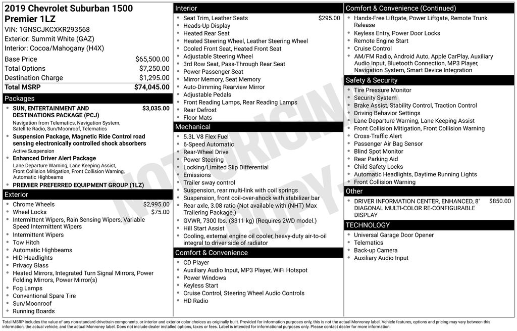 2019 Chevrolet Suburban Premier Summit White Premier RWD 6-Speed Automatic Electronic with Overdrive EcoTec3 5.3L V8 10 Speakers, 12-Volt Auxiliary Power Outlet (5), 1st & 2nd Row Color-Keyed Carpeted Floor Mats, 3.08 Rear Axle Ratio, 3rd Row 60/40 Power Fold Split-Bench, 3rd Row DVD Screen, 3rd row seats: split-bench, 4-Wheel Antilock Disc Brakes, 4-Wheel Disc Brakes, 6-Way Power Front Passenger Seat Adjuster, ABS brakes, Adaptive suspension, Adjustable pedals, Air Conditioning, Alloy wheels, AM/FM radio: SiriusXM, AM/FM Stereo w/Navigation, Apple CarPlay/Android Auto, Auto High-beam Headlights, Auto-dimming door mirrors, Auto-Dimming Inside Rear-View Mirror, Auto-dimming Rear-View mirror, Automatic temperature control, Black Assist Steps, Bodyside moldings, Bose Centerpoint Premium 10-Speaker Surround Sound, Brake assist, Bumpers: body-color, CD player, Color-Keyed Carpeting Floor Covering, Compass, Delay-off headlights, Driver door bin, Driver Inboard & Front Passenger Airbags, Driver vanity mirror, Dual front impact airbags, Dual front side impact airbags, Electronic Cruise Control w/Set & Resume Speed, Electronic Stability Control, Emergency communication system: OnStar and Chevrolet connected services capable, Enhanced Driver Alert Package, Enhanced Driver Information Center, Exterior Parking Camera Rear, Floor Console w/Storage Area, Fog Lamps, Forward Collision Alert, Front & Rear Park Assist, Front anti-roll bar, Front Bucket Seats, Front Center Armrest, Front dual zone A/C, Front fog lights, Front reading lights, Front wheel independent suspension, Fully automatic headlights, Garage door transmitter, Hands-Free Power Liftgate, HD Radio, Head-Up Display, Headphones, Heated & Ventilated Driver & Front Passenger Seats, Heated & Ventilated Front Reclining Bucket Seats, Heated 2nd Row Outboard Seats, Heated door mirrors, Heated front seats, Heated Leather Wrapped Steering Wheel, Heated rear seats, Heated steering wheel, High-Intensity Discharge Headlights, Illuminated entry, IntelliBeam w/Automatic High Beam On/Off, Lane Change Alert w/Side Blind Zone Alert, Lane Keep Assist w/Lane Departure Warning, Leather Shift Knob, Low Speed Forward Automatic Braking, Low tire pressure warning, Magnetic Ride Control Suspension Package, Memory seat, Memory Settings, Navigation System, Occupant sensing airbag, Outside temperature display, Overhead airbag, Overhead console, Panic alarm, Passenger door bin, Passenger vanity mirror, Passive Entry System, Pedal memory, Perforated Leather-Appointed Seat Trim, Power door mirrors, Power driver seat, Power Folding & Adjustable Heated Outside Mirrors, Power Liftgate, Power passenger seat, Power Release 2nd Row Bucket Seats, Power steering, Power Tilt & Telescoping Steering Column, Power Tilt-Sliding Sunroof w/Express-Open/Close, Power windows, Power-Adjustable Accelerator & Brake Pedals, Preferred Equipment Group 1LZ, Push Button Keyless Start, Rain sensing wipers, Rear air conditioning, Rear anti-roll bar, Rear audio controls, Rear Cross Traffic Alert, Rear reading lights, Rear Seat Entertainment System, Rear window defroster, Rear window wiper, Remote keyless entry, Remote Vehicle Start, Roof rack: rails only, Roof-Mounted Luggage Rack Side Rails, Safety Alert Seat, Security system, Single-Slot CD/MP3 Player, SiriusXM NavTraffic, SiriusXM Radio, Speed control, Speed-sensing steering, Split folding rear seat, Spoiler, Steering wheel memory, Steering wheel mounted audio controls, Sun, Entertainment & Destinations Package, Tachometer, Telescoping steering wheel, Tilt steering wheel, Traction control, Trip computer, Turn signal indicator mirrors, Universal Home Remote, Variably intermittent wipers, Ventilated front seats, Voltmeter, Wheel Locks (Set of 4) (LPO), Wheels: 20" x 9" Polished-Aluminum, Wheels: 22" 6-Spoke Chrome, Wireless Charging.