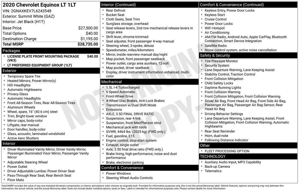 2020 Chevrolet Equinox LT FWD 6-Speed Automatic Electronic with Overdrive 1.5L DOHC Summit White
