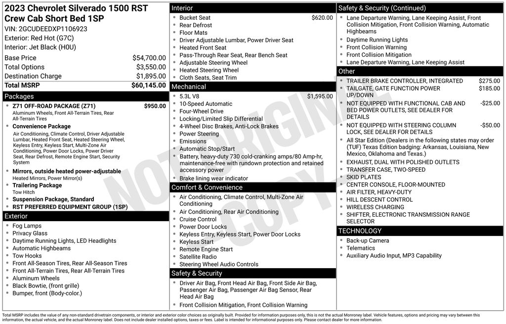 10-Speed Automatic, 4WD, Black Cloth, 10-Way Power Driver Seat w/Lumbar, 12.3" Multicolor Reconfigurable Digital Display, 120-Volt Bed Mounted Power Outlet, 120-Volt Instrument Panel Power Outlet, 170 Amp Alternator, 2 USB Data Ports, 220 Amp Alternator, 3.23 Rear Axle Ratio, 4-Wheel Disc Brakes, 40/20/40 Front Split-Bench Seat, 6 Speakers, 6-Speaker Audio System, ABS brakes, Air Conditioning, All-Star Edition, Alloy wheels, AM/FM radio: SiriusXM with 360L, Apple CarPlay/Android Auto, Auto High-beam Headlights, Auto-Locking Rear Differential, Automatic Emergency Braking, Automatic temperature control, Auxiliary External Transmission Oil Cooler, Bluetooth® For Phone, Brake assist, Bumpers: body-color, Chevrolet Connected Access Capable, Cloth Seat Trim, Color-Keyed Carpeting Floor Covering, Compass, Convenience Package, Deep-Tinted Glass, Delay-off headlights, Driver door bin, Driver vanity mirror, Dual Exhaust w/Polished Outlets, Dual front impact airbags, Dual front side impact airbags, Dual Rear USB Ports (Charge Only), Dual-Zone Automatic Climate Control, Electric Rear-Window Defogger, Electrical Steering Column Lock, Electronic Cruise Control, Electronic Stability Control, Electronic Transmission Range Selector Shifter, External Engine Oil Cooler, EZ Lift Power Lock & Release Tailgate, Floor Mounted Center Console, Following Distance Indicator, Forward Collision Alert, Front anti-roll bar, Front Bucket Seats, Front Center Armrest w/Storage, Front dual zone A/C, Front fog lights, Front Frame-Mounted Black Recovery Hooks, Front LED Fog Lamps, Front Pedestrian Braking, Front reading lights, Front Rubberized Vinyl Floor Mats, Front wheel independent suspension, Fully automatic headlights, HD Rear Vision Camera, Heated door mirrors, Heated Driver & Front Outboard Passenger Seats, Heated front seats, Heated Power-Adjustable Outside Mirrors, Heated Steering Wheel, Heated steering wheel, Heavy-Duty Air Filter, High Gloss Black Mirror Caps, Hill Descent Control, Hitch Guidance, Illuminated entry, Inside Rear-View Mirror w/Tilt, Integrated Trailer Brake Controller, IntelliBeam Automatic High Beam On/Off, Keyless Open & Start, Lane Keep Assist w/Lane Departure Warning, LED Cargo Area Lighting, Low tire pressure warning, Not Equipped w/Functional Cab & Bed Power Outlets, Not Equipped w/Steering Column Lock, Occupant sensing airbag, Off-Road Suspension, OnStar & Chevrolet Connected Services Capable, Outside temperature display, Overhead airbag, Overhead console, Panic alarm, Passenger door bin, Passenger vanity mirror, Power door mirrors, Power driver seat, Power Front Windows w/Driver Express Up/Down, Power Front Windows w/Passenger Express Down, Power Rear Windows w/Express Down, Power steering, Power Tailgate, Power windows, Preferred Equipment Group 1SP, Premium audio system: Chevrolet Infotainment 3 Premium, Radio data system, Radio: Chevrolet Infotainment 3 Premium System, Rear 60/40 Folding Bench Seat (Folds Up), Rear reading lights, Rear Rubberized-Vinyl Floor Mats, Rear step bumper, Rear window defroster, Remote keyless entry, Remote Vehicle Starter System, Security system, SiriusXM w/360L, Speed control, Speed-sensing steering, Split folding rear seat, Standard Suspension Package, Standard Tailgate, Steering Wheel Audio Controls, Steering wheel mounted audio controls, Tachometer, Telescoping steering wheel, Theft Deterrent System (Unauthorized Entry), Tilt steering wheel, Traction control, Trailering Package, Trip computer, Variably intermittent wipers, Voltmeter, Wheels: 18" x 8.5" Bright Silver Painted Aluminum, Wi-Fi Hot Spot Capable, Wireless Charging, Wireless Phone Projection, Wrapped Steering Wheel, Z71 Off-Road Package, 10-Speed Automatic, 4WD, Black Cloth.