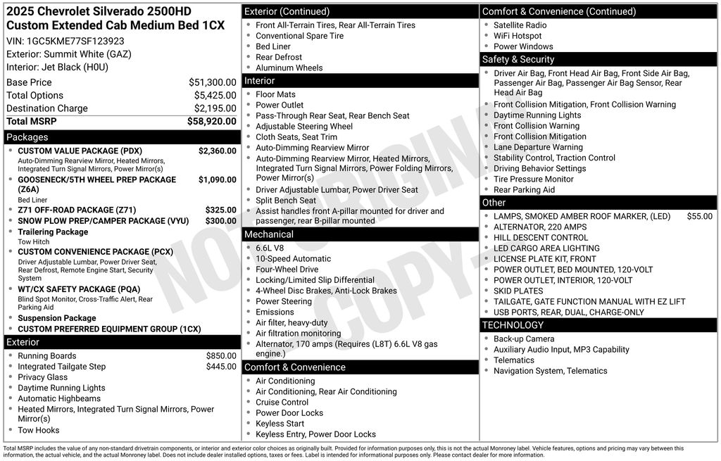 2025 Chevrolet Silverado 2500HD Custom Summit White Custom 4WD 10-Speed Automatic 6.6L V8 10-Speed Automatic, 4WD, Black Cloth, 10-Way Power Driver Seat Adjuster with Lumbar, 120-Volt Bed Mounted Power Outlet, 120-Volt Interior Power Outlet, 170 Amp Alternator, 2-Speed Electronic Shift Transfer Case, 220 Amp Alternator, 3.5" Diagonal Monochromatic Display DIC, 3.73 Rear Axle Ratio, 4-Wheel Disc Brakes, 6 Speakers, 6-Speaker Audio System, 6" Rectangular Chromed Tubular Assist Steps, 720 Cold-Cranking Amps Heavy-Duty Battery, ABS brakes, Air Conditioning, Alloy wheels, AM/FM radio: SiriusXM with 360L, Apple CarPlay/Android Auto, Auto High-beam Headlights, Auto-Dimming Inside Rear-View Mirror, Black Chevytec Spray-on Bedliner, Black Mirror Caps, Bluetooth® For Phone, Brake assist, Chevrolet Connected Access Capable, Cloth Seat Trim, Color-Keyed Carpeting Floor Covering, Compass, Custom Convenience Package, Custom Value Package, CX Safety Package, Deep-Tinted Glass, Delay-off headlights, Driver door bin, Dual front impact airbags, Dual front side impact airbags, Dual Rear USB Ports (charge Only), Durabed Pickup Bed, Electric Rear-Window Defogger, Electronic Cruise Control with Set and Resume Speed, Electronic Stability Control, Emergency communication system: OnStar, EZ Lift Power Lock and Release Tailgate, Front 40/20/40 Split-Bench Seats with Lockable Storage, Front anti-roll bar, Front Center Armrest w/Storage, Front License Plate Kit, Front reading lights, Front Rubberized Vinyl Floor Mats, Front wheel independent suspension, Fully automatic headlights, Gooseneck/5th Wheel Prep Package, HD Rear Vision Camera, Heated and Auto-Dimming Vertical Trailering Mirrors, Heated door mirrors, Heated Vertical Trailering Mirrors, Hill Descent Control, Illuminated entry, Lane Change Alert with Side Blind Zone Alert, LED Cargo Area Lighting, LED Smoked Amber Roof Marker Lamps, Locking Tailgate, Low tire pressure warning, Manual Tailgate Function with No EZ Lift, Manual Tilt-Wheel Steering Column, Multi-Flex Tailgate, Occupant sensing airbag, Off-Road Suspension, OnStar Services Capable, Outside temperature display, Overhead airbag, Overhead console, Panic alarm, Passenger door bin, Passenger vanity mirror, Power Door Locks, Power door mirrors, Power Front Windows with Driver Express Up/Down, Power Front Windows with Passenger Express Down, Power Rear Windows with Express Down, Power steering, Power windows, Preferred Equipment Group 1CX, Premium audio system: Chevrolet Infotainment 3, Push Button Start, Radio: Chevrolet Infotainment 3 System, Rear 60/40 Folding Bench Seat (folds Up), Rear Cross Traffic Alert, Rear reading lights, Rear Rubberized Vinyl Floor Mats, Rear step bumper, Remote Keyless Entry, Remote keyless entry, Remote Vehicle Starter System, SiriusXM with 360L Trial Subscription, Snow Plow Prep/Camper Package, Speed control, Split folding rear seat, Standard Tailgate, Suspension Package, Tachometer, Tilt steering wheel, Traction control, Trip computer, Turn signal indicator mirrors, Ultrasonic Front and Rear Park Assist, Unauthorized Entry Theft-Deterrent System, Variably intermittent wipers, Voltmeter, Wheels: 20" 10-Spoke Machined Aluminum, Wi-Fi Hotspot Capable, Wireless Phone Projection, Z71 Off-Road Package, 10-Speed Automatic, 4WD, Black Cloth.
