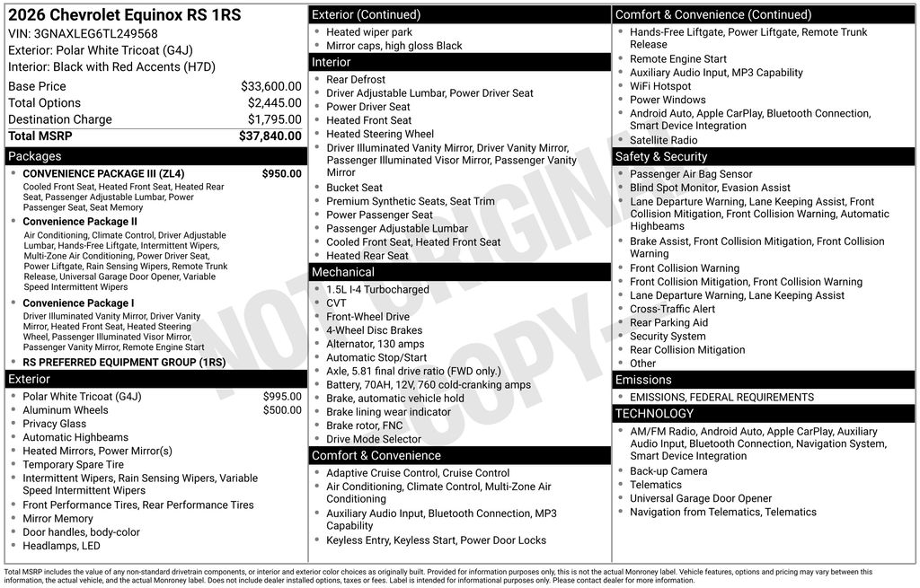 2026 Chevrolet Equinox RS Polar White Tricoat RS FWD CVT 1.5L DOHC 2-Way Power Driver Lumbar Control Seat Adjuster, 4-Wheel Disc Brakes, 5.81 Final Drive Axle Ratio, 6 Speakers, ABS brakes, Air Conditioning, Alloy wheels, AM/FM radio: SiriusXM, Auto High-beam Headlights, Automatic temperature control, Brake assist, Bumpers: body-color, Compass, Convenience Package III, Delay-off headlights, Driver 8-Way Power Seat Adjuster, Driver door bin, Driver vanity mirror, Dual front impact airbags, Dual front side impact airbags, Electronic Stability Control, Emergency communication system: OnStar and Chevrolet connected services capable, Evotex Seat Trim, Four wheel independent suspension, Front anti-roll bar, Front Bucket Seats, Front Center Armrest, Front dual zone A/C, Front Passenger 2-Way Power Lumbar Seat Adjuster, Front Passenger 4-Way Manual Seat Adjuster, Front Passenger 8-Way Power Seat Adjuster, Front reading lights, Fully automatic headlights, Garage door transmitter, Heated door mirrors, Heated Driver and Front Passenger Seats, Heated front seats, Heated Rear Outboard Seating Positions, Illuminated entry, Low tire pressure warning, Memory Settings, Navigation System, Occupant sensing airbag, Outside temperature display, Overhead airbag, Overhead console, Panic alarm, Passenger door bin, Passenger vanity mirror, Power door mirrors, Power driver seat, Power Liftgate, Power steering, Power windows, Preferred Equipment Group 1RS, Premium audio system: Chevrolet Infotainment 3, Radio data system, Radio: 11.3" Diagonal Advanced Color LCD Display, Rain sensing wipers, Rear anti-roll bar, Rear reading lights, Rear seat center armrest, Rear window defroster, Rear window wiper, Remote keyless entry, Security system, SiriusXM with 360L Trial Subscription, Speed control, Speed-sensing steering, Split folding rear seat, Spoiler, Sport steering wheel, Steering wheel mounted audio controls, Tachometer, Telescoping steering wheel, Tilt steering wheel, Traction control, Trip computer, Variably intermittent wipers, Ventilated Driver Seat, Ventilated Front Passenger Seat, Wheels: 19" Carbon Flash Metallic Aluminum, Wheels: 20" Black Machined-Face Aluminum.