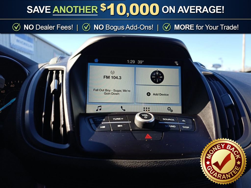 110V/150W AC Power Outlet, 3.21 Axle Ratio, 4-Wheel Disc Brakes, 6 Speakers, 9 Speakers, ABS brakes, Air Conditioning, All-Weather Floor Mats (Front & Rear), Alloy wheels, AM/FM radio: SiriusXM, Automatic temperature control, Black Roof-Rack Side Rails, BLIS w/Cross Traffic Alert, Brake assist, Bumpers: body-color, CD player, Compass, Delay-off headlights, Driver door bin, Driver vanity mirror, Dual front impact airbags, Dual front side impact airbags, Electronic Stability Control, Emergency communication system: 911 Assist, Equipment Group 201A, Exterior Parking Camera Rear, Four wheel independent suspension, Front anti-roll bar, Front Bucket Seats, Front Center Armrest, Front dual zone A/C, Front fog lights, Front reading lights, Fully automatic headlights, Halogen Projector Headlamps, Heated Front Seats, Illuminated entry, Knee airbag, Low tire pressure warning, Occupant sensing airbag, One-Touch-Up/Down Front & Rear Windows, Outside temperature display, Overhead airbag, Overhead console, Panic alarm, Passenger door bin, Passenger vanity mirror, Power door mirrors, Power driver seat, Power steering, Power windows, Radio data system, Radio: AM/FM Single CD/MP3, Rear anti-roll bar, Rear seat center armrest, Rear window defroster, Rear window wiper, Remote keyless entry, Reverse Sensing System, SE Cold Weather Package, SE Technology Package, Speed control, Speed-sensing steering, Split folding rear seat, Steering wheel mounted audio controls, Supplemental PTC Heater, SYNC 3 Communications & Entertainment System, SYNC Communications & Entertainment System, SYNC Connect, Tachometer, Telescoping steering wheel, Tilt steering wheel, Traction control, Trip computer, Unique Cloth Buckets w/60/40 Split Rear Seat, Variably intermittent wipers, Wheels: 17 Sparkle Silver Painted Aluminum, Windshield Wiper De-Icer.2017 Ford Escape SE FWD 6-Speed Automatic 1.5L EcoBoost Ingot SilverOdometer is 38632 miles below market average! 23/30 City/Highway MPGAwards:* 2017 KBB.com 10 Best SUVs Under $25,000 * 2017 KBB.com 10 Best Used Compact SUVs Under $15,000 * 2017 KBB.com 10 Most Awarded Brands * 2017 KBB.com Brand Image AwardsReviews:* Optional 2.0-liter turbocharged engine provides quick acceleration; high-tech features include Sync 3 infotainment, Apple CarPlay and Android Auto; responsive steering and carlike handling around turns. Source: Edmunds