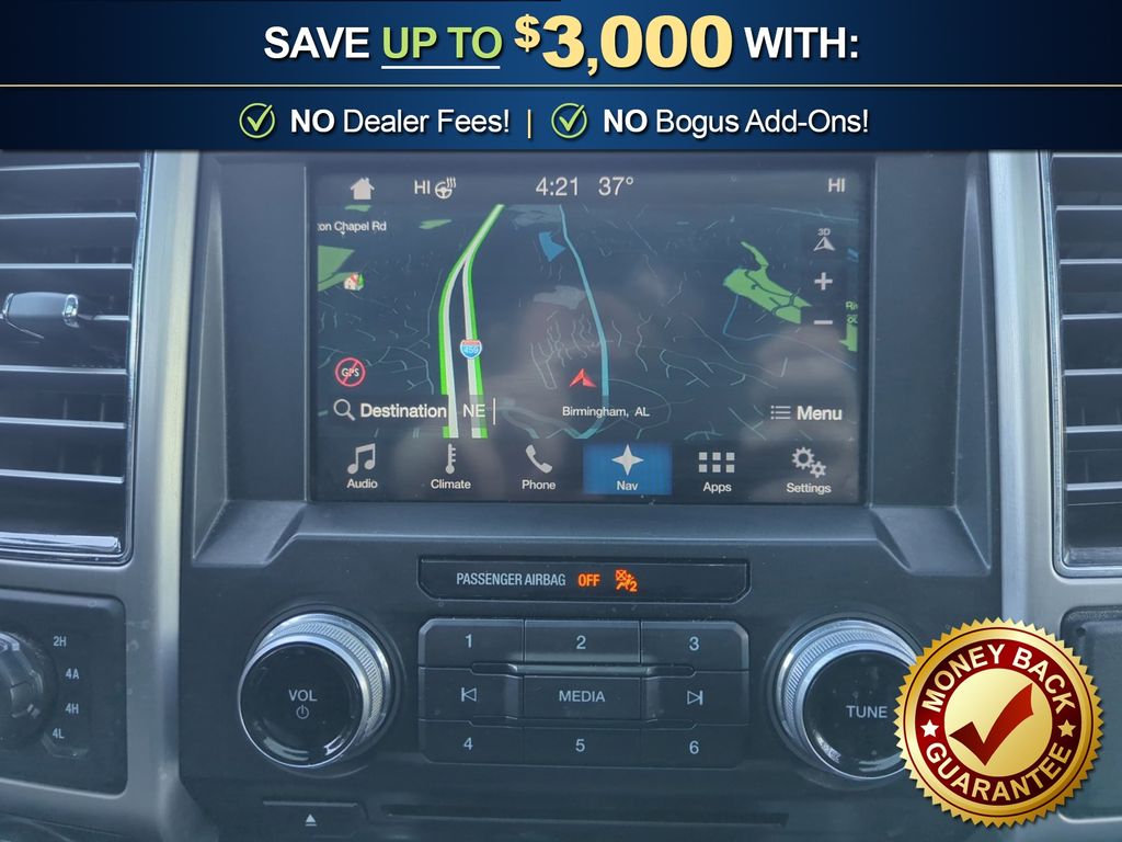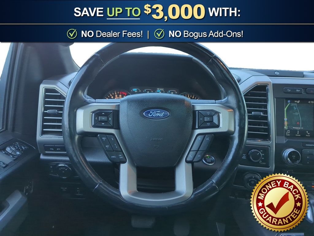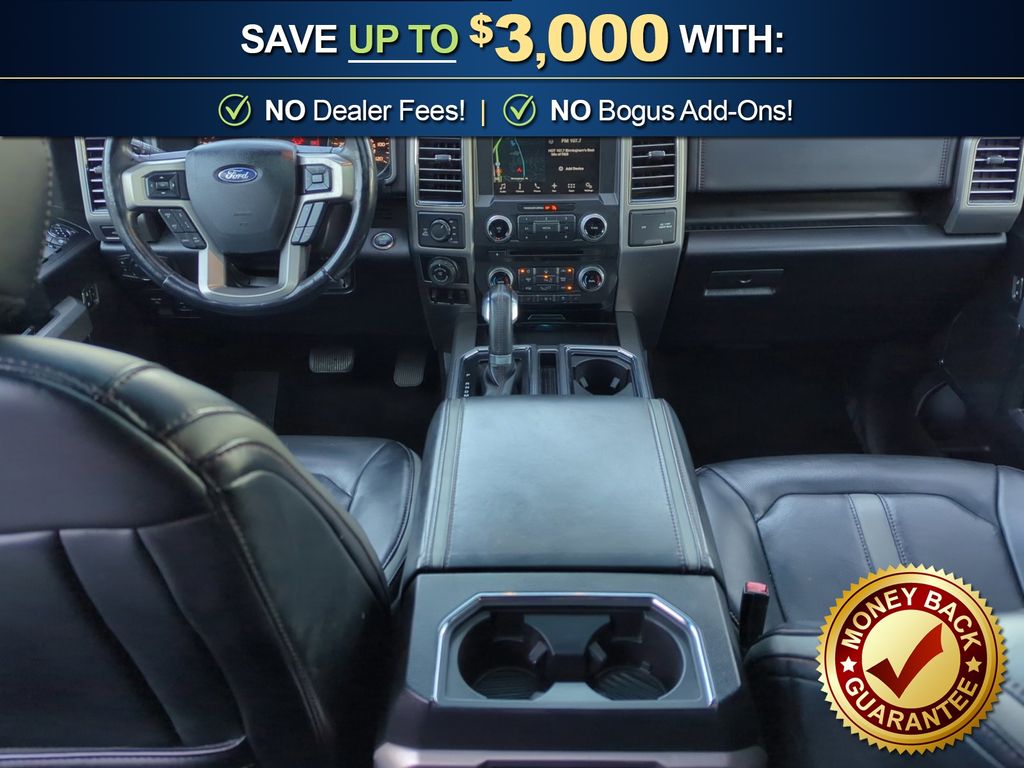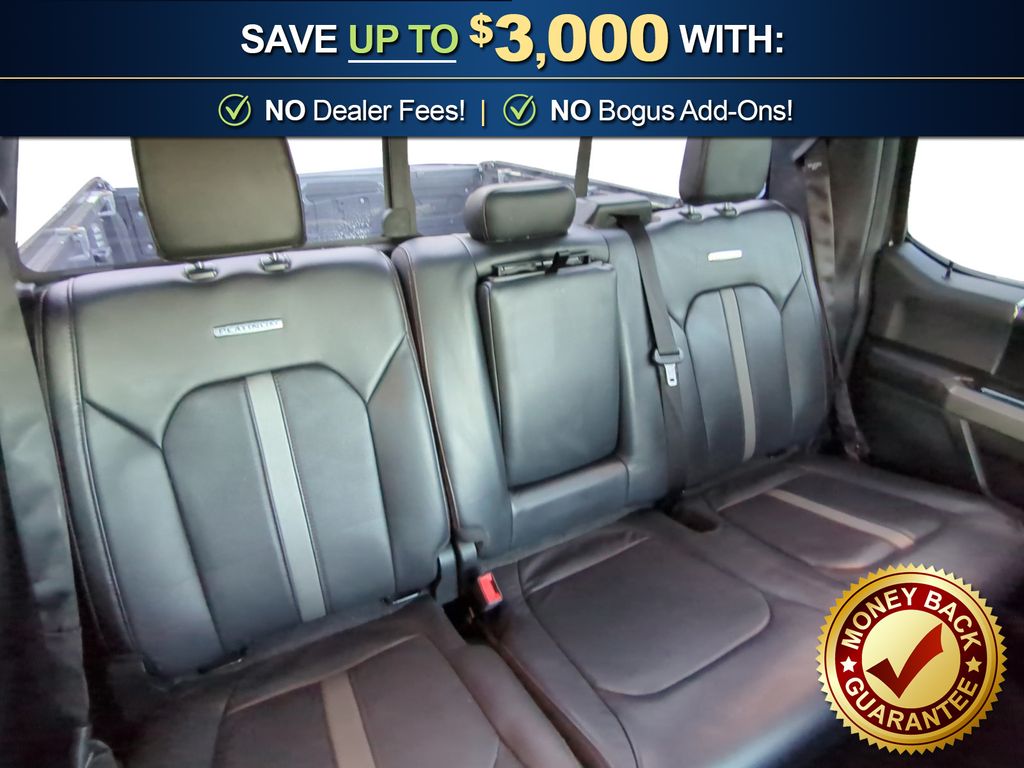 4WD, 10 Speakers, 20" Polished Aluminum Wheels, 3.31 Axle Ratio, 4-Wheel Disc Brakes, 4x4 FX4 Off-Road Bodyside Decal, ABS brakes, Active Park Assist, Adaptive Cruise Control, Adjustable pedals, Air Conditioning, All-Weather Rubber Floor Mats, Alloy wheels, AM/FM radio: SiriusXM, AppLink/Apple CarPlay and Android Auto, Auto High-beam Headlights, Auto tilt-away steering wheel, Auto-dimming door mirrors, Auto-dimming Rear-View mirror, Automatic temperature control, Black Unique Multi-Contour Leather Bucket Seats, Brake assist, Bumpers: body-color, CD player, Class IV Trailer Hitch Receiver, Compass, Delay-off headlights, Driver door bin, Driver vanity mirror, Dual front impact airbags, Dual front side impact airbags, Electronic Stability Control, Emergency communication system: SYNC 3 911 Assist, Equipment Group 701A Luxury, Exterior Parking Camera Rear, Front anti-roll bar, Front Bucket Seats, Front Center Armrest, Front dual zone A/C, Front fog lights, Front reading lights, Front wheel independent suspension, Fully automatic headlights, FX4 Off-Road Package, Garage door transmitter, Genuine wood door panel insert, GVWR: 7,050 lbs Payload Package, Heated door mirrors, Heated front seats, Heated rear seats, Heated steering wheel, Higher-Capacity Radiator, Higher-Power Cooling Fans, Hill Descent Control, Illuminated entry, Integrated Trailer Brake Controller, Lane-Keeping System, Low tire pressure warning, Memory seat, Navigation System, Occupant sensing airbag, Off-Road Tuned Front Shock Absorbers, Outside temperature display, Overhead airbag, Overhead console, Panic alarm, Passenger door bin, Passenger vanity mirror, Pedal memory, Power door mirrors, Power driver seat, Power passenger seat, Power steering, Power windows, Pro Trailer Backup Assist, Radio data system, Radio: B&O Play Premium Audio System, Rain sensing wipers, Rear Parking Sensors, Rear reading lights, Rear seat center armrest, Rear step bumper, Rear window defroster, Remote keyless entry, Security system, Speed control, Speed-sensing steering, Split folding rear seat, Steering wheel memory, Steering wheel mounted audio controls, SYNC 3, Tachometer, Tailgate Step w/Tailgate Lift Assist, Technology Package, Telescoping steering wheel, Tilt steering wheel, Traction control, Trailer Tow Package, Trip computer, Turn signal indicator mirrors, Twin Panel Moonroof, Upgraded Front Stabilizer Bar, Variably intermittent wipers, Ventilated front seats, Voice-Activated Touchscreen Navigation System, Voltmeter, 4WD.