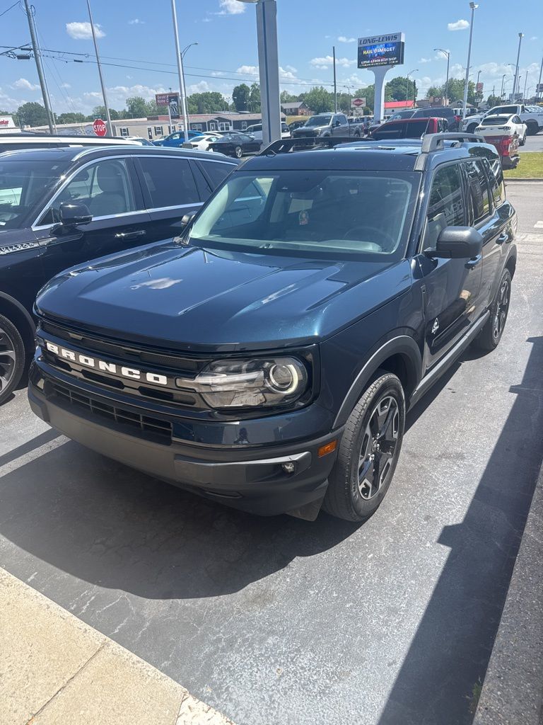 2023 Ford Bronco Sport Outer Banks Alto Blue Metallic Tinted Clearcoat Outer Banks 4WD 8-Speed Automatic 1.5L EcoBoost 3.80 Axle Ratio, 4-Wheel Disc Brakes, 6 Speakers, ABS brakes, Air Conditioning, Alloy wheels, AM/FM radio: SiriusXM, AM/FM Stereo, Auto High-beam Headlights, Auto-dimming Rear-View mirror, Automatic temperature control, Brake assist, Cargo Management System, Compass, Delay-off headlights, Driver door bin, Driver vanity mirror, Dual front impact airbags, Dual front side impact airbags, Electronic Stability Control, Emergency communication system: SYNC 3 911 Assist, Equipment Group 300A, Four wheel independent suspension, Front anti-roll bar, Front Bucket Seats, Front Center Armrest, Front dual zone A/C, Front fog lights, Front License Plate Bracket, Front reading lights, Fully automatic headlights, HD Radio, Heated door mirrors, Heated front seats, Heated steering wheel, Illuminated entry, Knee airbag, Leather Trimmed Heated Sport Contour Bucket Seats, Low tire pressure warning, Memory seat, Occupant sensing airbag, Outside temperature display, Overhead airbag, Overhead console, Painted Shadow Black Roof, Panic alarm, Passenger door bin, Passenger vanity mirror, Power door mirrors, Power driver seat, Power Moonroof, Power passenger seat, Power steering, Power windows, Radio data system, Rain sensing wipers, Rear anti-roll bar, Rear Parking Sensors, Rear reading lights, Rear seat center armrest, Rear window defroster, Rear window wiper, Remote keyless entry, Security system, SiriusXM, Speed control, Speed-sensing steering, Speed-Sensitive Wipers, Split folding rear seat, Steering wheel mounted audio controls, SYNC 3 Communications & Entertainment System, SYNC 3/Apple CarPlay/Android Auto, Tachometer, Tech Package, Telescoping steering wheel, Tilt steering wheel, Traction control, Trip computer, Universal Garage Door Opener (UGDO), Variably intermittent wipers, Wheels: 18" Ebony Black-Painted Aluminum, Wireless Charging Pad.