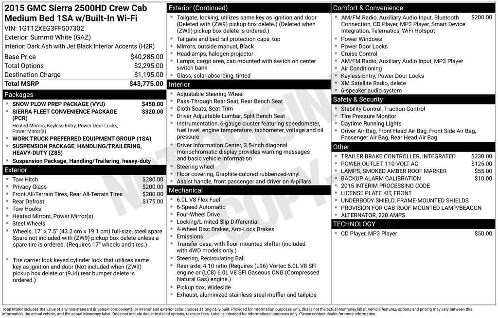 2015 GMC Sierra 2500HD Base Summit White 4WD 6-Speed Automatic HD Electronic with Overdrive Vortec 6.0L V8 SFI Flex Fuel VVT 6-Speed Automatic HD Electronic with Overdrive, 4WD, Dark Ash With Jet Black Interior Accents Cloth, 110-Volt AC Power Outlet, 17" Steel Wheels, 220 Amps Alternator, 3.5" Diagonal Monochromatic Display DIC, 4-Wheel Disc Brakes, 4.10 Rear Axle Ratio, 6 Speakers, ABS brakes, Air Conditioning, AM/FM radio, Black Outside Manual Mirrors, Black Power-Adjustable Heated Outside Mirrors, Bluetooth® For Phone, Brake assist, Bumpers: chrome, Cloth Seat Trim, Deep-Tinted Glass, Delay-off headlights, Driver door bin, Dual front impact airbags, Dual front side impact airbags, Electric Rear-Window Defogger, Electronic Stability Control, Front 40/20/40 Reclining Split-Bench Seat, Front anti-roll bar, Front Center Armrest w/Storage, Front License Plate Kit, Front reading lights, Front wheel independent suspension, Fully automatic headlights, Heavy-Duty Trailering Equipment, Integrated Trailer Brake Controller, Low tire pressure warning, Occupant sensing airbag, Overhead airbag, Overhead console, Passenger door bin, Passenger vanity mirror, Power steering, Power windows, Power Windows w/Driver Express Up & Down, Provision for Cab Roof-Mounted Lamp/Beacon, Radio: AM/FM Stereo w/4.2" Diagonal Color Display, Radio: AM/FM Stereo w/IntelliLink, Rear 60/40 Folding Bench Seat (Folds Up), Rear reading lights, Rear seat center armrest, Rear step bumper, Remote Keyless Entry, Single Slot CD/MP3 Player, Smoked Amber Roof Marker Lamps, Snow Plow Prep Package, Speed control, Split folding rear seat, Standard Suspension Package, Steering Wheel, Tachometer, Tilt steering wheel, Traction control, Trip computer, Variably intermittent wipers, Voltmeter, Work Truck Package, 6-Speed Automatic HD Electronic with Overdrive, 4WD, Dark Ash With Jet Black Interior Accents Cloth.