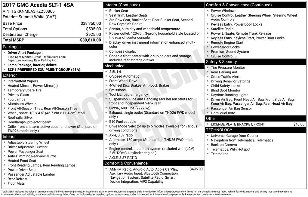 2017 GMC Acadia SLT-1 Summit White SLT-1 FWD 6-Speed Automatic 2.5L 4-Cylinder DGI DOHC VVT FWD, Jet Black Leather, 18" x 7.5" Aluminum (4) Wheels, 3.87 Axle Ratio, 3rd row seats: split-bench, 4-Wheel Disc Brakes, 6-Passenger (2-2-2 Seating Configuration), 8 Speakers, ABS brakes, Air Conditioning, Alloy wheels, AM/FM radio: SiriusXM, Apple CarPlay/Android Auto, Auto-dimming door mirrors, Auto-dimming Rear-View mirror, Automatic temperature control, Brake assist, Bumpers: body-color, Compass, Delay-off headlights, Driver door bin, Driver vanity mirror, Dual front impact airbags, Dual front side impact airbags, Electronic Stability Control, Emergency communication system: OnStar Guidance, Exterior Parking Camera Rear, Four wheel independent suspension, Front anti-roll bar, Front Bucket Seats, Front Center Armrest, Front dual zone A/C, Front fog lights, Front License Plate Bracket, Front reading lights, Fully automatic headlights, Garage door transmitter, Heated door mirrors, Heated front seats, Illuminated entry, Knee airbag, Low tire pressure warning, Occupant sensing airbag, Outside temperature display, Overhead airbag, Overhead console, Panic alarm, Passenger door bin, Passenger vanity mirror, Perforated Leather-Appointed Seat Trim, Power door mirrors, Power driver seat, Power Liftgate, Power passenger seat, Power steering, Power windows, Preferred Equipment Group 4SA, Premium audio system: IntelliLink, Radio data system, Radio: AM/FM 8" Diagonal Color Touch Navigation, Radio: AM/FM 8" Diagonal Color Touch Screen, Rear air conditioning, Rear anti-roll bar, Rear reading lights, Rear window defroster, Rear window wiper, Remote keyless entry, Roof rack: rails only, Security system, SiriusXM Satellite Radio, Speed control, Speed-sensing steering, Spoiler, Steering wheel mounted audio controls, Tachometer, Telescoping steering wheel, Tilt steering wheel, Traction control, Trip computer, Variably intermittent wipers, Voltmeter, FWD, Jet Black Leather.