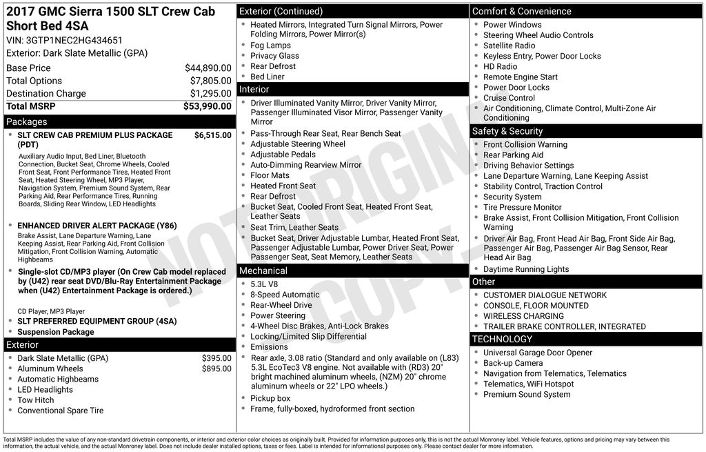 2017 GMC Sierra 1500 SLT Dark Slate Metallic SLT RWD 8-Speed Automatic with Overdrive EcoTec3 5.3L V8 8-Speed Automatic with Overdrive, Cocoa/Dune Leather, 10-Way Power Driver's Seat Adjuster, 110-Volt AC Power Outlet, 150 Amp Alternator, 1st & 2nd Row Color-Keyed Carpeted Floor Mats, 20" x 9" Chrome Clad Aluminum Wheels, 20" x 9" Polished Aluminum Wheels, 3.08 Rear Axle Ratio, 3.42 Rear Axle Ratio, 4-Wheel Disc Brakes, 4.2" Diagonal Color Display Driver Info Center, 40/20/40 Front Split Bench Seat, 6 Speakers, 6-Speaker Audio System, 6" Rectangular Chromed Tubular Assist Steps, ABS brakes, Adjustable pedals, Air Conditioning, Alloy wheels, AM/FM radio, Auto-dimming door mirrors, Auto-Dimming Inside Rear-View Mirror, Auto-dimming Rear-View mirror, Automatic temperature control, Auxiliary External Transmission Oil Cooler, Bodyside moldings, Brake assist, Bumpers: chrome, CD player, Chrome Bodyside Moldings, Chrome Door Handles, Chrome Mirror Caps, Color-Keyed Carpeting, Compass, Deep-Tinted Glass, Delay-off headlights, Driver & Front Passenger Illuminated Vanity Mirrors, Driver door bin, Driver vanity mirror, Dual front impact airbags, Dual front side impact airbags, Dual-Zone Automatic Climate Control, Electric Rear-Window Defogger, Electronic Stability Control, Emergency communication system: OnStar Guidance, Enhanced Driver Alert Package, Exterior Parking Camera Rear, EZ Lift & Lower Tailgate, Floor Mounted Console, Forward Collision Alert, Front anti-roll bar, Front Center Armrest w/Storage, Front dual zone A/C, Front fog lights, Front Full Feature Power Reclining Bucket Seats, Front reading lights, Front wheel independent suspension, Fully automatic headlights, Garage door transmitter: HomeLink, HD Radio, Heated & Ventilated Front Bucket Seats, Heated door mirrors, Heated Driver & Front Passenger Seats, Heated front seats, Heavy Duty Suspension, Heavy-Duty Rear Locking Differential, High-Intensity Discharge Headlights, High-Performance LED Headlamps, Illuminated entry, Integrated Trailer Brake Controller, IntelliBeam Automatic High Beam On/Off Headlight, Lane Keep Assist, Leather Appointed Seat Trim, Leather Wrapped Heated Steering Wheel, Leather Wrapped Steering Wheel w/Cruise Controls, LED Cargo Box Lighting, LED Tailamps w/Signature, Low Speed Forward Automatic Braking, Low tire pressure warning, Manual Tilt/Telescoping Steering Column, Memory seat, Occupant sensing airbag, OnStar 3 Month Guidance Plan, OnStar w/4G LTE, Outside temperature display, Overhead airbag, Overhead console, Panic alarm, Passenger door bin, Passenger vanity mirror, Power Adjustable Pedals, Power door mirrors, Power driver seat, Power Folding & Adjustable Heated Outside Mirrors, Power passenger seat, Power Sliding Rear Window w/Defogger, Power steering, Power windows, Power Windows w/Driver Express Up & Down, Preferred Equipment Group 4SA, Radio data system, Radio: AM/FM Stereo w/8" Diagonal Color Touch Nav., Radio: AM/FM Stereo w/8" Diagonal Color Touch Screen, Rear 60/40 Folding Bench Seat (Folds Up), Rear reading lights, Rear seat center armrest, Rear step bumper, Rear Vision Camera, Rear Wheelhouse Liners, Rear window defroster, Remote Keyless Entry, Remote keyless entry, Remote Locking Tailgate, Remote Vehicle Starter System, Security system, Single Slot CD/MP3 Player, SiriusXM Satellite Radio, SLT Crew Cab Premium Plus Package, Speed control, Speed-sensing steering, Split folding rear seat, Spray-On Pickup Box Bed Liner w/GMC Logo, Steering Wheel Audio Controls, Steering wheel mounted audio controls, Tachometer, Telescoping steering wheel, Theft Deterrent System (Unauthorized Entry), Thin Profile LED Fog Lamps, Tilt steering wheel, Traction control, Trailering Equipment, Trip computer, Turn signal indicator mirrors, Ultrasonic Front & Rear Park Assist, Universal Home Remote, Variably intermittent wipers, Voltmeter, Wheels: 18" x 8.5" Polished Aluminum, Wireless Charging, 8-Speed Automatic with Overdrive, Cocoa/Dune Leather.
