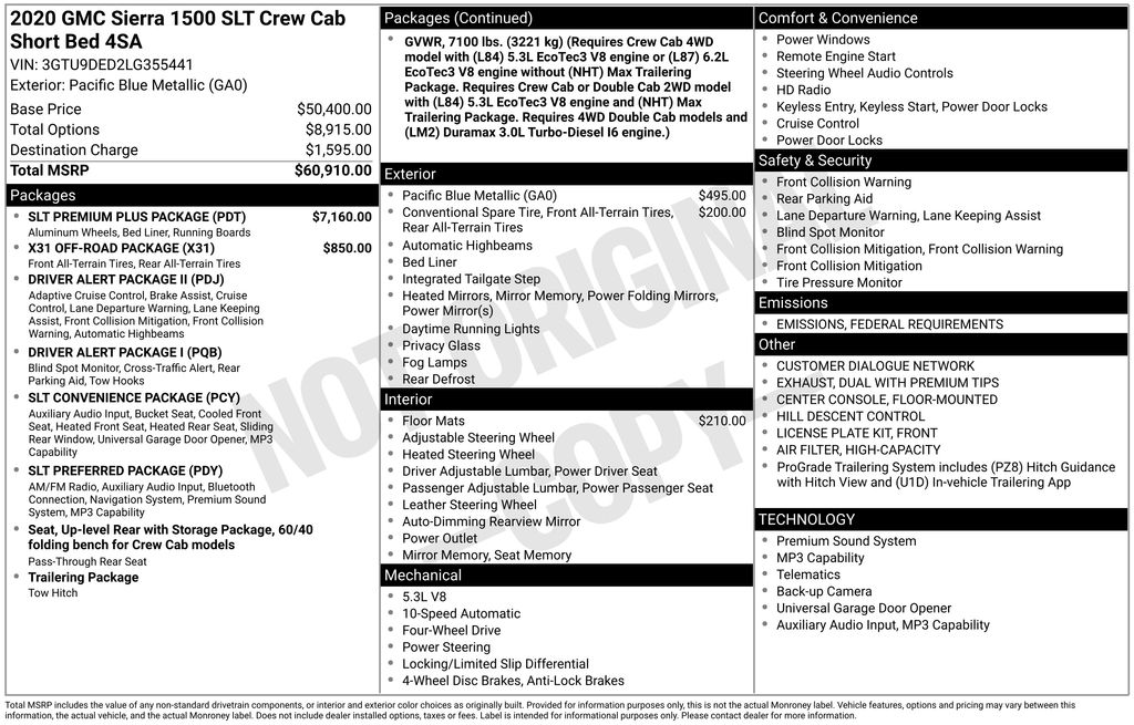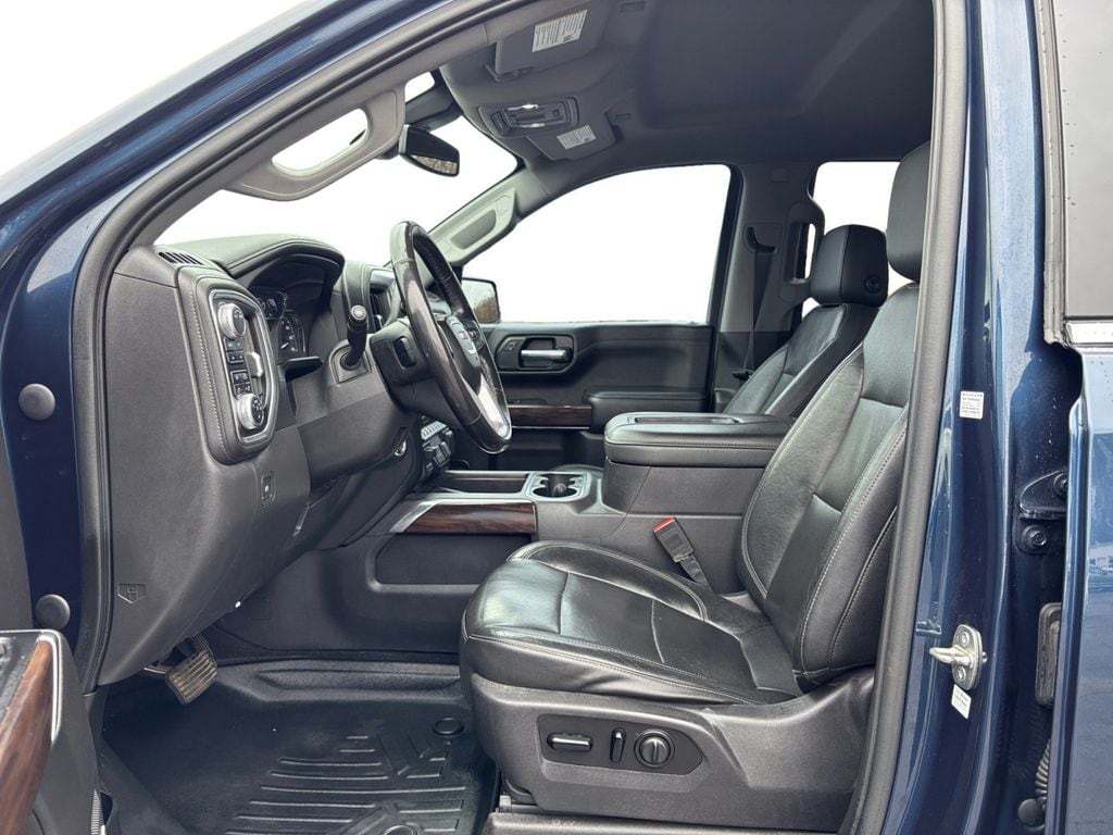 2020 GMC Sierra 1500 SLT Pacific Blue Metallic SLT 4WD 10-Speed Automatic EcoTec3 5.3L V8 10-Speed Automatic, 4WD, Jet Black Leather, 10-Way Power Driver Seat Adjuster w/Lumbar, 10-Way Power Passenger Seat Adjuster w/Lumbar, 12-Volt Rear Auxiliary Power Outlet, 120-Volt Bed Mounted Power Outlet, 120-Volt Instrument Panel Power Outlet, 170 Amp Alternator, 2 USB Ports, 2 USB Ports (1st Row), 20" x 9" Polished Aluminum Wheels, 3.23 Rear Axle Ratio, 4-Wheel Disc Brakes, 4G LTE Wi-Fi Hotspot Capable, 6 Speakers, 6-Speaker Audio System Feature, ABS brakes, Adaptive Cruise Control - Camera, Air Conditioning, All-Weather Floor Liner (LPO), Alloy wheels, AM/FM radio: SiriusXM with 360L, Apple CarPlay/Android Auto, Auto-dimming door mirrors, Auto-dimming Rear-View mirror, Automatic Emergency Braking, Automatic temperature control, Auxiliary External Transmission Oil Cooler, Brake assist, Bumpers: chrome, Chrome Grille, Chrome Wheel To Wheel Assist Steps, Color-Keyed Carpeting Floor Covering, Compass, Deep-Tinted Glass, Delay-off headlights, Driver Alert Package I, Driver Alert Package II, Driver door bin, Driver Memory, Driver vanity mirror, Dual Exhaust w/Premium Tips, Dual front impact airbags, Dual front side impact airbags, Electric Rear-Window Defogger, Electrical Lock Control Steering Column, Electronic Stability Control, Floor-Mounted Center Console, Following Distance Indicator, Forward Collision Alert, Front 40/20/40 Split-Bench Seat, Front anti-roll bar, Front Bucket Seats, Front Center Armrest w/Storage, Front dual zone A/C, Front fog lights, Front Frame-Mounted Black Recovery Hooks, Front License Plate Kit, Front Pedestrian Braking, Front reading lights, Front wheel independent suspension, Fully automatic headlights, GMC Connected Access Capable, HD Radio, Heated 2nd Row Outboard Seats, Heated door mirrors, Heated Driver & Front Outboard Passenger Seating, Heated front seats, Heated steering wheel, Heavy Duty Suspension, Heavy-Duty Rear Locking Differential, High-Capacity Air Filter, Hill Descent Control, Hitch Guidance, Hitch Guidance w/Hitch View, Illuminated entry, In-Vehicle Trailering App, Integrated Trailer Brake Controller, IntelliBeam Automatic High Beam On/Off, Keyless Open & Start, Lane Change Alert w/Side Blind Zone Alert, Lane Keep Assist w/Lane Departure Warning, LED Cargo Area Lighting, Low tire pressure warning, Manual Tilt-Wheel & Telescoping Steering Column, Memory seat, Occupant sensing airbag, Off-Road Suspension, OnStar & GMC Connected Services Capable, Outside temperature display, Overhead airbag, Overhead console, Panic alarm, Passenger door bin, Passenger vanity mirror, Perforated Leather-Appointed Front Seat Trim, Perimeter Lighting, Power Door Locks, Power door mirrors, Power driver seat, Power Front Passenger Windows w/Express Up/Down, Power Front Windows w/Driver Express Up/Down, Power passenger seat, Power Rear Windows w/Express Down, Power Sliding Rear Window w/Rear Defogger, Power steering, Power windows, Preferred Equipment Group 4SA, Premium audio system: GMC Infotainment System, Premium Bose 7-Speaker Sound System, ProGrade Trailering System, Radio data system, Radio: Premium GMC Infotainment Sys w/Multi-Touch, Radio: Premium GMC Infotainment Sys w/Navigation, Rear Cross Traffic Alert, Rear Dual USB Charging-Only Ports, Rear reading lights, Rear seat center armrest, Rear step bumper, Rear Wheelhouse Liners, Rear window defroster, Remote keyless entry, Remote Vehicle Starter System, Safety Alert Seat, Security system, SiriusXM w/360L, SLT Convenience Package, SLT Preferred Package, SLT Premium Plus Package, Speed control, Speed-sensing steering, Split folding rear seat, Spray-On Pickup Bed Liner w/GMC Logo, Steering Wheel Audio Controls, Steering wheel mounted audio controls, Tachometer, Telescoping steering wheel, Theft Deterrent System (Unauthorized Entry), Tilt steering wheel, Traction control, Trailer Tire Pressure Monitor System, Trailering Package