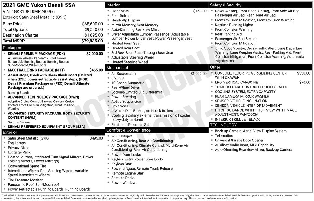 2021 GMC Yukon Denali Satin Steel Metallic Denali RWD 10-Speed Automatic with Overdrive EcoTec3 6.2L V8 12-Way Power Seat Adjusters, 14 Speakers, 15" Diagonal Multi-Color Head-Up Display, 2 Presets For Outside Rearview Mirrors, 3.23 Rear Axle Ratio, 3rd Row 60/40 Power-Folding Split-Bench Seat, 3rd row seats: split-bench, 4-Wheel Disc Brakes, ABS brakes, Adaptive Cruise Control, Adaptive suspension, Advanced Security Package, Advanced Technology Package, Air Conditioning, Air Ride Adaptive Suspension, All-Weather Cargo Mat (LPO), Alloy wheels, AM/FM radio: SiriusXM with 360L, Apple CarPlay/Android Auto, Auto High-beam Headlights, Auto-dimming door mirrors, Auto-dimming Rear-View mirror, Auto-leveling suspension, Automatic Emergency Braking, Automatic temperature control, Bodyside moldings, Bose 14-Speaker Surround w/CenterPoint, Brake assist, Bright Front & Rear Door Sill Plates, Bumpers: body-color, Chrome Door Handles w/Body-Color Strip, Compass, Delay-off headlights, Denali Premium Package, Driver door bin, Driver vanity mirror, Dual Exhaust System, Dual front impact airbags, Dual front side impact airbags, Dual-Pane Panoramic Power Sunroof, Electronic Stability Control, Emergency communication system: OnStar and GMC connected services capable, Enhanced Automatic Emergency Braking, Extra Capacity Cooling System, Floor Console, Following Distance Indicator, Forward Collision Alert, Four wheel independent suspension, Front & Rear Park Assist, Front anti-roll bar, Front Bucket Seats, Front Center Armrest, Front dual zone A/C, Front fog lights, Front Pedestrian Braking, Front reading lights, Fully automatic headlights, Galvano Bodyside Moldings, Garage door transmitter, Glass Breakage Sensor, Hands-Free Power Programmable Rear Liftgate, HD Radio, HD Surround Vision, Heads-Up Display, Heated & Ventilated Driver & Front Passenger Seats, Heated 2nd Row Outboard Position Seats, Heated Automatic Steering Wheel, Heated door mirrors, Heated Driver & Front Passenger Seats, Heated front seats, Heated rear seats, Heated steering wheel, Hitch Guidance w/Hitch View, Illuminated entry, In-Vehicle Trailering App, Inside Rear-View Auto-Dimming Mirror, Inside Rearview Auto-Dimming Rear Camera Mirror, Integrated Trailer Brake Controller, IntelliBeam Automatic High Beam On/Off, Jet Black Interior Trim, Lane Change Alert w/Side Blind Zone Alert, Lane Keep Assist w/Lane Departure Warning, Leather steering wheel, Low tire pressure warning, Magnetic Ride Control Suspension, Max Trailering Package, Memory seat, Navigation System, Occupant sensing airbag, Outside Heated Power-Adjustable Mirrors, Outside temperature display, Overhead airbag, Overhead console, Panic alarm, Passenger door bin, Passenger vanity mirror, Perforated Leather Seating Surfaces, Power door mirrors, Power driver seat, Power Liftgate, Power passenger seat, Power Release 2nd Row Bucket Seats, Power steering, Power Tilt & Telescopic Steering Column, Power windows, Power-Retractable Assist Steps, Preferred Equipment Group 5SA, Radio: AM/FM/SiriusXM w/Navigation, Rain sensing wipers, Rear air conditioning, Rear anti-roll bar, Rear Camera Mirror Washer, Rear Cross Traffic Alert, Rear Pedestrian Alert, Rear reading lights, Rear window defroster, Rear window wiper, Remote keyless entry, Roof rack: rails only, Safety Alert Seat, Security system, SiriusXM w/360L, Speed control, Speed-sensing steering, Split folding rear seat, Spoiler, Steering wheel memory, Steering wheel mounted audio controls, Tachometer, Telescoping steering wheel, Theft-Deterrent Alarm System, Tilt steering wheel, Traction control, Trailer Side Blind Zone Alert, Trip computer, Turn signal indicator mirrors, Universal Home Remote, Variably intermittent wipers, Vehicle Inclination Sensor, Vehicle Interior Movement Sensor, Ventilated front seats, Vertical Cargo Net (LPO), Voltmeter, Wheel Locks, Wheels: 20" x 9" 6-Spoke Polished Aluminum, Wheels: 22" x 9" Bright Machined Aluminum.