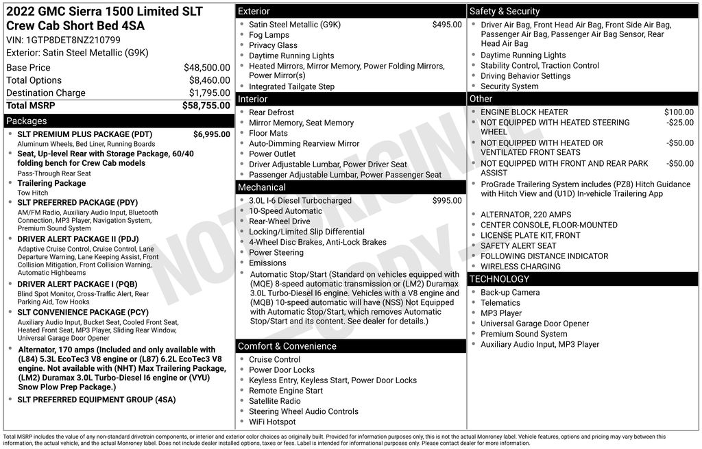 Recent Arrival! 10-Way Power Driver Seat Adjuster w/Lumbar, 10-Way Power Passenger Seat Adjuster w/Lumbar, 12-Volt Rear Auxiliary Power Outlet, 120-Volt Bed Mounted Power Outlet, 120-Volt Instrument Panel Power Outlet, 170 Amp Alternator, 2 USB Ports, 2 USB Ports (1st Row), 20" x 9" Polished Aluminum Wheels, 220 Amp Alternator, 3.23 Rear Axle Ratio, 4-Wheel Disc Brakes, 6 Speakers, 6-Speaker Audio System Feature, ABS brakes, Adaptive Cruise Control, Air Conditioning, Alloy wheels, AM/FM radio: SiriusXM with 360L, Apple CarPlay/Android Auto, Auto-dimming door mirrors, Auto-dimming Rear-View mirror, Auto-Locking Rear Differential, Automatic Emergency Braking, Automatic temperature control, Auxiliary External Transmission Oil Cooler, Brake assist, Bumpers: chrome, Chrome Grille, Chrome Wheel To Wheel Assist Steps, Color-Keyed Carpeting Floor Covering, Compass, Deep-Tinted Glass, Delay-off headlights, Driver Alert Package I, Driver Alert Package II, Driver door bin, Driver Memory, Driver vanity mirror, Dual front impact airbags, Dual front side impact airbags, Electric Rear-Window Defogger, Electronic Stability Control, Engine Block Heater, Floor-Mounted Center Console, Following Distance Indicator, Forward Collision Alert, Front 40/20/40 Split-Bench Seat, Front anti-roll bar, Front Bucket Seats, Front Center Armrest w/Storage, Front dual zone A/C, Front fog lights, Front Frame-Mounted Black Recovery Hooks, Front License Plate Kit, Front Pedestrian Braking, Front reading lights, Front wheel independent suspension, Fully automatic headlights, GMC Connected Access Capable, Heated door mirrors, Heated Driver & Front Outboard Passenger Seating, Heated front seats, Heated Steering Wheel, Heated steering wheel, Heavy Duty Suspension, Hitch Guidance, Hitch Guidance w/Hitch View, Illuminated entry, In-Vehicle Trailering App, Integrated Trailer Brake Controller, IntelliBeam Automatic High Beam On/Off, Keyless Open & Start, Lane Change Alert w/Side Blind Zone Alert, Lane Keep Assist w/Lane Departure Warning, LED Cargo Area Lighting, Low tire pressure warning, Manual Tilt-Wheel & Telescoping Steering Column, Memory seat, Not Equipped w/Front & Rear Park Assist, Not Equipped w/Heated Steering Wheel, Not Equipped w/Heated/Ventilated Front Seats, Occupant sensing airbag, OnStar & GMC Connected Services Capable, Outside temperature display, Overhead airbag, Overhead console, Panic alarm, Passenger door bin, Passenger vanity mirror, Perf Leather-Appointed Front Outboard Seat Trim, Perimeter Lighting, Power Door Locks, Power door mirrors, Power driver seat, Power Front Passenger Windows w/Express Up/Down, Power Front Windows w/Driver Express Up/Down, Power passenger seat, Power Rear Windows w/Express Down, Power Sliding Rear Window w/Rear Defogger, Power steering, Power windows, Preferred Equipment Group 4SA, Premium audio system: Premium GMC Infotainment System, Premium Bose 7-Speaker Sound System, ProGrade Trailering System, Radio data system, Radio: Premium GMC Infotainment Sys w/Multi-Touch, Radio: Premium GMC Infotainment Sys w/Navigation, Rear Cross Traffic Alert, Rear Dual USB Charging-Only Ports, Rear reading lights, Rear seat center armrest, Rear step bumper, Rear Wheelhouse Liners, Rear window defroster, Remote keyless entry, Remote Vehicle Starter System, Safety Alert Seat, Security system, SiriusXM w/360L, SLT Convenience Package, SLT Preferred Package, SLT Premium Plus Package, Speed control, Speed-sensing steering, Split folding rear seat, Spray-On Pickup Bed Liner w/GMC Logo, Steering Wheel Audio Controls, Steering wheel mounted audio controls, Tachometer, Telescoping steering wheel, Theft Deterrent System (Unauthorized Entry), Tilt steering wheel, Traction control, Trailering Package, Trip computer, Ultrasonic Front & Rear Park Assist, Universal Home Remote, Variably intermittent wipers, Ventilated Driver & Front Passenger Seats, Voltmeter, Wheels: 18" x 8.5" 6-Spoke Machined Aluminum, Wi-Fi Hotspot Capable, Wireless Charging.