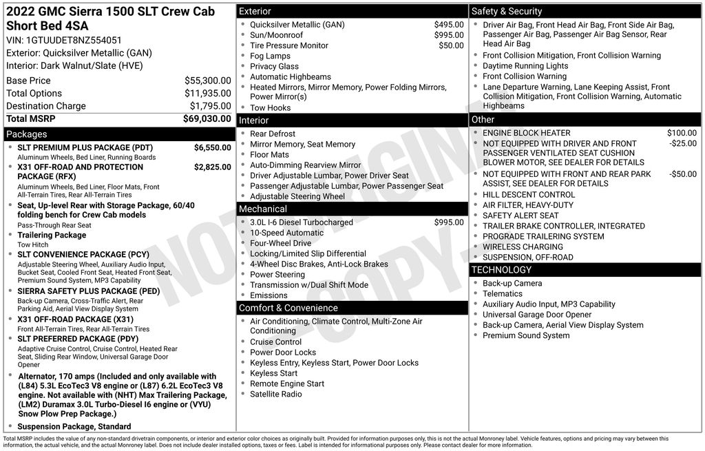 2022 GMC Sierra 1500 SLT Quicksilver Metallic SLT 4WD 10-Speed Automatic 3.0L I6 10-Speed Automatic, 4WD, Dark Walnut/Slate Leather, 10-Way Power Driver Seat Adjuster w/Lumbar, 10-Way Power Passenger Seat Adjuster w/Lumbar, 120-Volt Bed Mounted Power Outlet, 120-Volt Instrument Panel Power Outlet, 170 Amp Alternator, 2 Charge/Data USB Ports, 2 Charge/Data USB Ports Inside Center Console, 2 Type-C Charge-Only Rear USB Ports, 20" Polished Aluminum Wheels, 220 Amp Alternator, 3.23 Rear Axle Ratio, 4-Wheel Disc Brakes, 6 Speakers, 6-Speaker Audio System Feature, ABS brakes, Adaptive Cruise Control, Air Conditioning, All-Weather Floor Liner (LPO), Alloy wheels, AM/FM radio: SiriusXM with 360L, Apple CarPlay/Android Auto, Auto High-beam Headlights, Auto-dimming door mirrors, Auto-dimming Rear-View mirror, Auto-Locking Rear Differential, Automatic Emergency Braking, Automatic temperature control, Auxiliary External Transmission Oil Cooler, Brake assist, Buckle to Drive, Bumpers: chrome, Chrome Header & Chrome Grille Insert Bars, Chrome Wheel To Wheel Assist Steps, Color-Keyed Carpeting Floor Covering, Compass, Deep-Tinted Glass, Delay-off headlights, Driver door bin, Driver Memory, Driver vanity mirror, Dual Exhaust System, Dual front impact airbags, Dual front side impact airbags, Electric Rear-Window Defogger, Electrical Steering Column Lock, Electronic Precision Shift, Electronic Stability Control, Emergency communication system: OnStar and GMC Connected Services capable, Engine Block Heater, Exterior Parking Camera Rear, Floor-Mounted Center Console, Following Distance Indicator, Forward Collision Alert, Front 40/20/40 Split-Bench Seat, Front anti-roll bar, Front Bucket Seats, Front Center Armrest w/Storage, Front dual zone A/C, Front fog lights, Front Frame-Mounted Black Recovery Hooks, Front License Plate Kit, Front Pedestrian Braking, Front Rainsensing Wipers, Front reading lights, Front wheel independent suspension, Fully automatic headlights, GMC Connected Access Capable, HD Rear Vision Camera, HD Surround Vision, Heated 2nd Row Outboard Seats, Heated door mirrors, Heated Driver & Front Outboard Passenger Seating, Heated front seats, Heated Steering Wheel, Heated steering wheel, Heavy-Duty Air Filter, High Capacity Suspension Package, Hill Descent Control, Hitch Guidance, Hitch Guidance w/Hitch View, Illuminated entry, In-Vehicle Trailering App, Integrated Trailer Brake Controller, IntelliBeam Automatic High Beam On/Off, Keyless Open & Start, Lane Keep Assist w/Lane Departure Warning, LED Cargo Area Lighting, Low tire pressure warning, Manual Tilt-Wheel & Telescoping Steering Column, Memory seat, Navigation System, Not Equip w/Heat & Vent Seat Cushion Blower Motor, Not Equipped w/Front & Rear Park Assist, Not Equipped w/Steering Column Lock, Occupant sensing airbag, Off-Road Suspension, OnStar & GMC Connected Services Capable, Outside temperature display, Overhead airbag, Overhead console, Panic alarm, Passenger door bin, Passenger vanity mirror, Perf Leather-Appointed Front Outboard Seat Trim, Perimeter Lighting, Power Door Locks, Power door mirrors, Power driver seat, Power Front Passenger Windows w/Express Up/Down, Power Front Windows w/Driver Express Up/Down, Power passenger seat, Power Rake & Telescoping Steering Column, Power Rear Windows w/Express Down, Power Sliding Rear Window w/Rear Defogger, Power steering, Power Sunroof, Power windows, Preferred Equipment Group 4SA, Premium audio system: GMC Infotainment System, Premium Bose 7-Speaker Sound System, ProGrade Trailering System, Push Button Start, Radio data system, Radio: Premium GMC Infotainment Audio System, Rain sensing wipers, Rear Cross Traffic Braking, Rear Pedestrian Detection, Rear reading lights, Rear seat center armrest, Rear step bumper, Rear Wheelhouse Liners, Rear window defroster, Remote keyless entry, Remote Vehicle Starter System, Safety Alert Seat, Security system, Sierra Safety Plus Package, SiriusXM w/360L, SLT Convenience Package, SLT Preferred