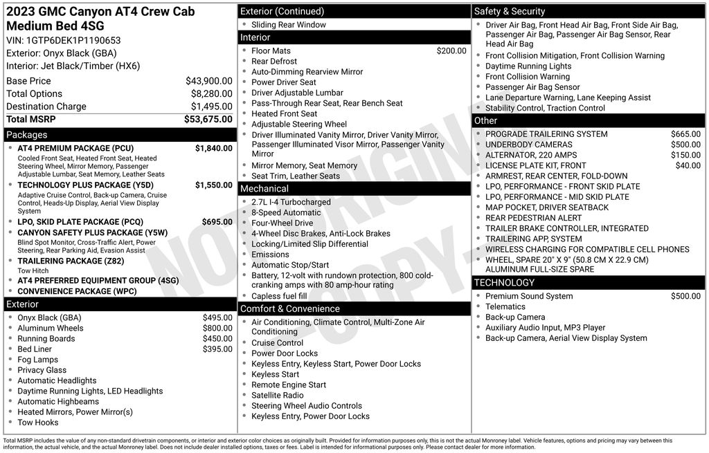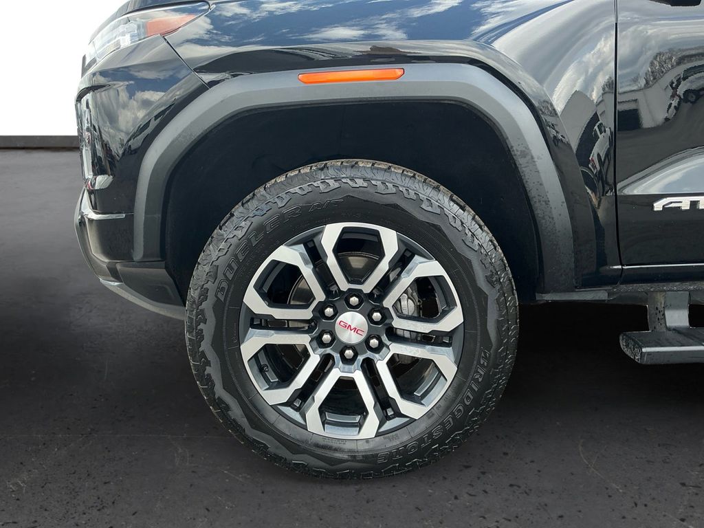 2023 GMC Canyon AT4 Onyx Black AT4 4WD 8-Speed Automatic 2.7L Turbo 4WD, 120-Volt Bed Mounted Power Outlet, 1st & 2nd Rows All-Weather Floor Liner (LPO), 2 1st Row USB Charge/Data Ports, 2 Rear USB Ports in Center Console (Charge-Only), 220 Amps Alternator, 3.42 Rear Axle Ratio, 4-Way Manual Front Passenger Seat Adjuster, 4-Wheel Disc Brakes, 6 Speakers, 6-Speaker Audio System Feature, 6-Way Power Passenger Seat Adjuster, 8-Way Power Driver Seat Adjuster, ABS brakes, Adaptive Cruise Control, Air Conditioning, Alloy wheels, AM/FM radio: SiriusXM, Apple CarPlay/Android Auto, AT4 Premium Package, Auto High-beam Headlights, Auto-dimming Rear-View mirror, Automatic Emergency Braking, Automatic Locking Rear Differential, Automatic Stop/Start, Automatic temperature control, Bedliner w/Integral Storage Compartments (LPO), Black Assist Step (LPO), Blind Zone Steering Assist, Brake assist, Bumpers: body-color, Canyon Pro Safety, Canyon Safety Plus Package, Cloth/CoreTec Seat Trim, Compass, Delay-off headlights, Driver & Front Passenger Illuminated Visors, Driver & Front Passenger Ventilated Seats, Driver door bin, Driver Memory, Driver Mode Selector, Driver Seatback Map Pocket, Driver vanity mirror, Dual front impact airbags, Dual front side impact airbags, Dual-Zone Automatic Air Conditioning, Electronic Stability Control, EZ-Lift & Lower Tailgate, Following Distance Indicator, Forward Collision Alert, Front anti-roll bar, Front Bucket Seats, Front Center Armrest, Front dual zone A/C, Front fog lights, Front LED Fog Lamps, Front License Plate Kit, Front Passenger Seatback Map Pocket, Front Pedestrian & Bicyclist Braking, Front reading lights, Front wheel independent suspension, HD Surround Vision, Heated door mirrors, Heated Driver & Front Passenger Seats, Heated front seats, Heated Power-Adjustable Outside Mirrors, Heated Steering Wheel, Illuminated entry, Inside Rear-View Auto-Dimming Mirror, Integrated Trailer Brake Controller, IntelliBeam Automatic High Beam On/Off, Interior Overhead Courtesy Light w/Dual Reading Lamp, Lane Keep Assist w/Lane Departure Warning, Low tire pressure warning, Manual Rear-Sliding Window, Multicolor 6.3" Diagonal Head-Up Display, MultiStow Tailgate, Navigation System, Occupant sensing airbag, Outside temperature display, Overhead airbag, Overhead console, Panic alarm, Passenger door bin, Passenger vanity mirror, Perforated Leather-Appointed Seat Trim, Power door mirrors, Power Driver Lumbar Control Seat Adjuster, Power driver seat, Power Passenger Lumbar Control Seat Adjuster, Power steering, Power windows, Preferred Equipment Group 4SG, Premium 7-Speaker Bose Sound System, ProGrade Trailering System, Radio data system, Radio: 11.3" Diagonal Premium GMC Infotainment Sys, Rear Center Fold-Down Armrest w/2 Cupholders, Rear Cross Traffic Braking, Rear of Console 120-Volt Power Outlet, Rear Pedestrian Alert, Rear reading lights, Rear step bumper, Rear window defroster, Rear-Window Electric Defogger, Remote keyless entry, Remote Vehicle Starter System, Security system, SiriusXM w/360L, Skid Plate Package (LPO), Speed control, Speed-sensing steering, Split folding rear seat, Steering wheel mounted audio controls, Stop/Start System Disable Button Engine Control, Tachometer, Tailgate Keyed Cylinder Lock, Technology Plus Package, Telescoping steering wheel, Tilt & Telescopic Manual Steering Column, Tilt steering wheel, Traction control, Trailering App System, Trailering Package, Trip computer, Ultrasonic Rear Park Assist, Underbody Cameras, Variably intermittent wipers, Wheels: 18" x 8.5" Dark Gray Machined Finish Alum, Wheels: 20" x 9" Full Gloss Dark Gray Aluminum, Wireless Apple CarPlay/Wireless Android Auto, Wireless Charging, 4WD.