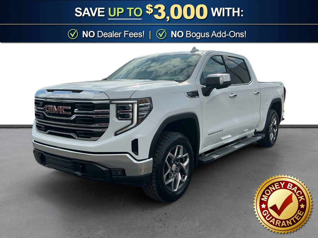 2023 GMC Sierra 1500 SLT Summit White SLT 4WD 10-Speed Automatic EcoTec3 5.3L V8 10-Speed Automatic, 4WD, Dark Walnut/Slate Leather, 10-Way Power Driver Seat Adjuster w/Lumbar, 10-Way Power Passenger Seat Adjuster w/Lumbar, 120-Volt Bed Mounted Power Outlet, 120-Volt Instrument Panel Power Outlet, 170 Amp Alternator, 2 Charge/Data USB Ports, 2 Charge/Data USB Ports Inside Center Console, 2 Type-C Charge-Only Rear USB Ports, 20" Polished Aluminum Wheels, 3.23 Rear Axle Ratio, 4-Wheel Disc Brakes, 6 Speakers, 6-Speaker Audio System Feature, ABS brakes, Adaptive Cruise Control, Air Conditioning, All-Weather Floor Liner (LPO), Alloy wheels, AM/FM radio, Apple CarPlay/Android Auto, Auto High-beam Headlights, Auto-dimming door mirrors, Auto-dimming Rear-View mirror, Auto-Locking Rear Differential, Automatic Emergency Braking, Automatic temperature control, Auxiliary External Transmission Oil Cooler, Brake assist, Buckle to Drive, Bumpers: chrome, Chrome Header & Chrome Grille Insert Bars, Chrome Wheel To Wheel Assist Steps, Color-Keyed Carpeting Floor Covering, Compass, Deep-Tinted Glass, Delay-off headlights, Driver door bin, Driver Memory, Driver vanity mirror, Dual Exhaust System, Dual front impact airbags, Dual front side impact airbags, Electric Rear-Window Defogger, Electrical Steering Column Lock, Electronic Precision Shift, Electronic Stability Control, Emergency communication system: OnStar and GMC connected services capable, Floor-Mounted Center Console, Following Distance Indicator, Forward Collision Alert, Front 40/20/40 Split-Bench Seat, Front anti-roll bar, Front Bucket Seats, Front Center Armrest w/Storage, Front dual zone A/C, Front fog lights, Front Frame-Mounted Black Recovery Hooks, Front Pedestrian Braking, Front Rainsensing Wipers, Front reading lights, Front wheel independent suspension, Fully automatic headlights, GMC Connected Access Capable, HD Rear Vision Camera, Heated 2nd Row Outboard Seats, Heated door mirrors, Heated Driver & Front Outboard Passenger Seating, Heated front seats, Heated steering wheel, Heavy-Duty Air Filter, High Capacity Suspension Package, Hill Descent Control, Hitch Guidance, Illuminated entry, IntelliBeam Automatic High Beam On/Off, Keyless Open & Start, Lane Keep Assist w/Lane Departure Warning, LED Cargo Area Lighting, Low tire pressure warning, Manual Tilt-Wheel & Telescoping Steering Column, Memory seat, Navigation System, Not Equipped w/Steering Column Lock, Occupant sensing airbag, Off-Road Suspension, OnStar & GMC Connected Services Capable, Outside temperature display, Overhead airbag, Overhead console, Panic alarm, Passenger door bin, Passenger vanity mirror, Perf Leather-Appointed Front Outboard Seat Trim, Perimeter Lighting, Power Door Locks, Power door mirrors, Power driver seat, Power Front Passenger Windows w/Express Up/Down, Power Front Windows w/Driver Express Up/Down, Power passenger seat, Power Rake & Telescoping Steering Column, Power Rear Windows w/Express Down, Power Sliding Rear Window w/Rear Defogger, Power steering, Power Sunroof, Power windows, Preferred Equipment Group 4SA, Premium audio system: GMC Infotainment System, Premium Bose 7-Speaker Sound System, Push Button Start, Radio data system, Radio: Premium GMC Infotainment Audio System, Rain sensing wipers, Rear reading lights, Rear seat center armrest, Rear step bumper, Rear Wheelhouse Liners, Rear window defroster, Remote keyless entry, Remote Vehicle Starter System, Security system, SiriusXM w/360L, SLT Convenience Package, SLT Preferred Package, Speed control, Speed-sensing steering, Split folding rear seat, Spray-On Pickup Bed Liner w/GMC Logo, Standard Suspension Package, Steering Wheel Audio Controls, Steering wheel mounted audio controls, Tachometer, Telescoping steering wheel, Theft Deterrent System (Unauthorized Entry), Tilt steering wheel, Traction control, Trailering Package, Trip computer, Universal Home Remote, Variably intermittent wipers, Ventilated Driver & Front Passenger Seats, Voltmeter