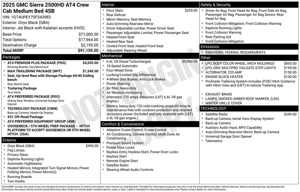 Priced below KBB Fair Purchase Price! 10-Speed Automatic, 4WD, Jet Black With Kalahari Accents Leather, 10-Way Power Driver Seat Adjuster w/Lumbar, 10-Way Power Passenger Seat Adjuster w/Lumbar, 120-Volt Bed Mounted Power Outlet, 120-Volt Instrument Panel Power Outlet, 1st & 2nd Rows All-Weather Floor Liners (LPO), 2 Charge-Only Rear USB Ports, 2 Charge/Data USB Ports Inside Center Console, 2 USB Ports, 2-Speed Active Transfer Case, 220-Amp Alternator, 3 Years SiriusXM, 4-Wheel Disc Brakes, 7 Speakers, ABS brakes, Air Conditioning, Alloy wheels, AM/FM radio: SiriusXM with 360L, Apple CarPlay/Android Auto, AT4 Preferred Package, AT4 Premium Plus Package, Auto High-beam Headlights, Auto-dimming door mirrors, Auto-dimming Rear-View mirror, Automatic Emergency Braking, Automatic temperature control, Bed View Camera w/2 Trailer Camera Provisions, Body Color Wheel Arch Moldings (LPO), Bose Premium 7-Speaker Sound System, Brake assist, Buckle to Drive, Bumpers: body-color, Compass, Deep-Tinted Glass, Delay-off headlights, Driver door bin, Driver Memory, Driver vanity mirror, Dual front impact airbags, Dual front side impact airbags, Electric Rear-Window Defogger, Electronic Stability Control, Emergency communication system: OnStar, Engine Block Heater, Exhaust Brake, Floor-Mounted Center Console, Following Distance Indicator, Forward Collision Alert, Front anti-roll bar, Front Bucket Seats, Front Center Armrest, Front dual zone A/C, Front fog lights, Front Pedestrian Braking, Front Prem Floor Liners w/Removable Carpet Insert, Front Rain-Sensing Wipers, Front reading lights, Front wheel independent suspension, Fully automatic headlights, Gloss Black Header Grille & Grille Insert Bars, GMC MultiPro Tailgate Step Lights (LPO), Gooseneck/5th Wheel Prep Package, HD Surround Vision, Heated 2nd Row Outboard Seats, Heated door mirrors, Heated Driver & Front Outboard Passenger Seats, Heated front seats, Heated rear seats, Heated steering wheel, Heavy-Duty 80 Amp Battery, Hill Descent Control, Hitch Guidance w/Hitch View, Illuminated entry, In-Vehicle Trailering System App, Inside Rearview Auto-Dimming Rear Camera Mirror, IntelliBeam Automatic High Beam On/Off, Keyless Open & Start, Lane Departure Warning System, LED Cargo Area Lighting, LED Smoked Amber Roof Marker Lamps, Low tire pressure warning, Manual Tilt-Wheel/Telescoping Steering Column, Max Trailering Package, Memory seat, Multicolor 15" Diagonal Head-Up Display, Occupant sensing airbag, Off-Road High Clearance Step (LPO), Off-Road Suspension, OnStar Services Capable, Outside temperature display, Overhead airbag, Overhead console, Panic alarm, Passenger door bin, Passenger vanity mirror, Perforated Leather-Appointed Front Seat Trim, Pickup Box, Power door mirrors, Power driver seat, Power Front Passenger Windows w/Express Up/Down, Power passenger seat, Power Sliding Rear Window w/Defogger, Power steering, Power Sunroof, Power windows, Preferred Equipment Group 4SB, Push Button Start, Radio: AM/FM w/Premium GMC Infotainment System, Rain sensing wipers, Rear Cross Traffic Alert, Rear Prem Floor Liners w/Removable Carpet Insert, Rear reading lights, Rear seat center armrest, Rear step bumper, Rear Wheelhouse Liners, Rear window defroster, Remote keyless entry, Remote Vehicle Starter System, Safety Alert Seat, Security system, SiriusXM w/360L Trial Subscription, Speed control, Speed-sensing steering, Split folding rear seat, Spray-On Pickup Bedliner w/GMC Logo, Steering Wheel Audio Controls, Steering wheel mounted audio controls, Tachometer, Technology Package, Telescoping steering wheel, Tilt steering wheel, Traction control, Trailer Cam Provisions & Trailer Viewing Software, Trailer Side Blind Zone Alert, Trip computer, Turn signal indicator mirrors, Ultrasonic Front & Rear Park Assist, Unauthorized Entry Theft-Deterrent System, Universal Home Remote, Variably intermittent wipers, Ventilated Driver & Front Passenger Seats, Ventilated front seats, Voltmeter, Wheels: 20" High Gloss Black
