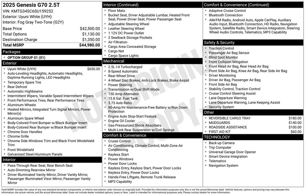 4-Wheel Disc Brakes, 6 Speakers, ABS brakes, Air Conditioning, Alloy wheels, AM/FM radio: SiriusXM, Android Auto & Apple CarPlay, Anti-whiplash front head restraints, Auto High-beam Headlights, Auto-dimming Rear-View mirror, Automatic temperature control, Brake assist, Bumpers: body-color, Delay-off headlights, Driver door bin, Driver vanity mirror, Dual front impact airbags, Dual front side impact airbags, Electronic Stability Control, Emergency communication system: Genesis Connected Services, Exterior Parking Camera Rear, First Aid Kit, Four wheel independent suspension, Front anti-roll bar, Front Bucket Seats, Front Center Armrest, Front dual zone A/C, Front reading lights, Fully automatic headlights, Garage door transmitter: HomeLink, Heated door mirrors, Heated front seats, Heated Multi-Adjustable Front Bucket Seats, Illuminated entry, Knee airbag, Leather steering wheel, Leatherette Seating Surfaces, Low tire pressure warning, Mudguards, Navigation System, Occupant sensing airbag, Option Group 01, Outside temperature display, Overhead airbag, Overhead console, Panic alarm, Passenger door bin, Passenger vanity mirror, Power door mirrors, Power driver seat, Power passenger seat, Power steering, Power windows, Radio: AM/FM/SiriusXM/HD Audio System, Rear anti-roll bar, Rear reading lights, Rear seat center armrest, Rear side impact airbag, Rear window defroster, Remote keyless entry, Reversible Cargo Tray, Roadside Assistance, Security system, Speed control, Speed-Sensitive Wipers, Split folding rear seat, Steering wheel mounted audio controls, Tachometer, Telescoping steering wheel, Traction control, Trip computer, Turn signal indicator mirrors, Variably intermittent wipers, Wheels: 19" x 8.0J Fr & 19" x 8.5J Rr Alloy.
