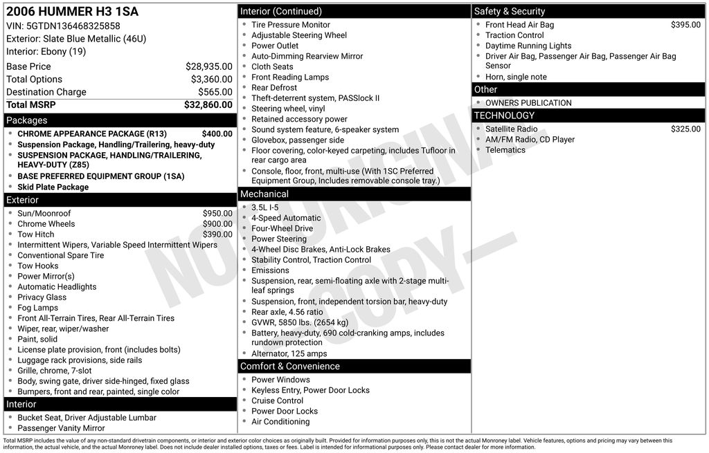 2006 Hummer H3 Slate Blue Metallic 4WD 4-Speed Automatic with Overdrive 3.5L 5-Cylinder MPI DOHC 16" x 7.5" Aluminum Wheels, 16" x 7.5" Chromed-Aluminum Wheels, 4-Wheel Disc Brakes, 4.56 Rear Axle Ratio, 6 Speakers, ABS brakes, Air Conditioning, Alloy wheels, AM/FM radio, Auto-dimming Rear-View mirror, CD player, Chrome Appearance Package, Cloth Seat Trim, Compass, Driver door bin, Dual front impact airbags, Emergency communication system: OnStar, Extra Large Power Sunroof, Front anti-roll bar, Front Bucket Seats, Front Center Armrest, Front fog lights, Front reading lights, Front Reclining Bucket Seats, Front wheel independent suspension, Fully automatic headlights, Heavy-Duty Handling/Trailering Suspension Package, Illuminated entry, Low tire pressure warning, Occupant sensing airbag, Outside temperature display, Panic alarm, Passenger door bin, Passenger vanity mirror, Power door mirrors, Power steering, Power windows, Preferred Equipment Group 1SA, Rear anti-roll bar, Rear window defroster, Rear window wiper, Remote keyless entry, Roof rack: rails only, Roof Rail w/Rollover Sensor Airbag System, Security system, Speed control, Split folding rear seat, StabiliTrak Vehicle Stability Enhancement System, Tachometer, Tilt steering wheel, Traction control, Trailering Equipment, Variably intermittent wipers, Voltmeter, XM Satellite Radio Sound System Feature.