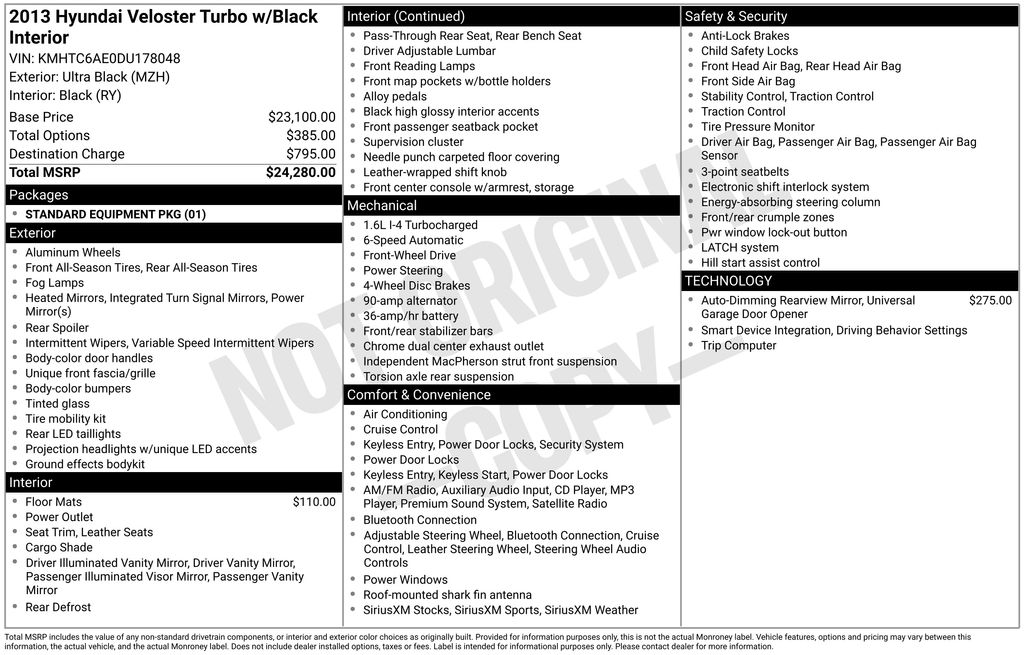 2013 Hyundai Veloster Turbo FWD 6-Speed Automatic with Shiftronic 1.6L I4 DGI DOHC 16V Turbocharged Ultra Black Pearl