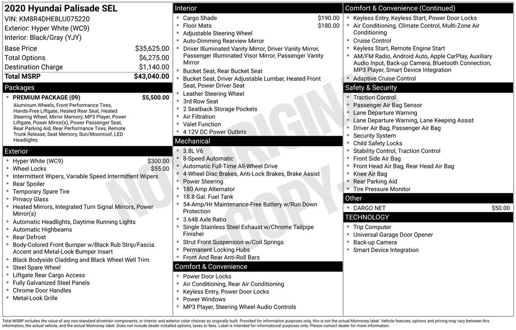 2020 Hyundai Palisade SEL Hyper White SEL AWD 8-Speed Automatic with SHIFTRONIC V6 115-Volt AC Power Outlet, 3.648 Axle Ratio, 3rd row seats: split-bench, 3rd Row USB Outlets, 4-Wheel Disc Brakes, 6 Speakers, 7" High Resolution Cluster Display, 8-Way Power Adjustable Passenger Seat, ABS brakes, Air Conditioning, Alloy wheels, AM/FM radio, Apple CarPlay & Android Auto, Artificial Leather-Wrapped Dashboard, Auto High-beam Headlights, Auto Leveling Rear Suspension, Auto-dimming Rear-View mirror, Automatic temperature control, Bi-LED Headlights, Brake assist, Bumpers: body-color, Cargo Cover/Screen, Cargo Net, Carpeted Floor Mats, Convenience Package P2, Delay-off headlights, Driver door bin, Driver vanity mirror, Dual front impact airbags, Dual front side impact airbags, Electronic Stability Control, Four wheel independent suspension, Front anti-roll bar, Front Bucket Seats, Front Center Armrest, Front dual zone A/C, Front reading lights, Fully automatic headlights, Garage door transmitter: HomeLink, Hands-Free Smart Liftgate w/Auto Open, Heated 2nd Row Seats, Heated door mirrors, Heated Front Bucket Seats, Heated front seats, Heated Steering Wheel, Illuminated entry, Integrated Memory System, Knee airbag, Leather Seat Trim, LED Taillights, Low tire pressure warning, Occupant sensing airbag, Outside temperature display, Overhead airbag, Overhead console, Panic alarm, Parking Distance Warning - Forward, Passenger door bin, Passenger vanity mirror, Power 3rd Row Seating, Power door mirrors, Power driver seat, Power steering, Power Sunroof P5, Power windows, Premium Package, Premium Package P3, Radio data system, Radio: AM/FM/MP3 Display Audio, Rear air conditioning, Rear anti-roll bar, Rear Side Window Sunshades, Rear window defroster, Rear window wiper, Reclining 3rd row seat, Remote keyless entry, Security system, Speed control, Speed-sensing steering, Split folding rear seat, Spoiler, Stain Resistant Cloth Seat Trim, Steering wheel mounted audio controls, Tachometer, Telescoping steering wheel, Tilt steering wheel, Traction control, Trip computer, Turn signal indicator mirrors, Ultrasonic Rear Seat Occupant Minder, Variably intermittent wipers, Wheel Locks, Wheels: 18" x 7.5J Machine Finish Alloy, Wheels: 20"x 7.5J Split 5-Spoke Machined Alloy, Wireless Phone Charger.