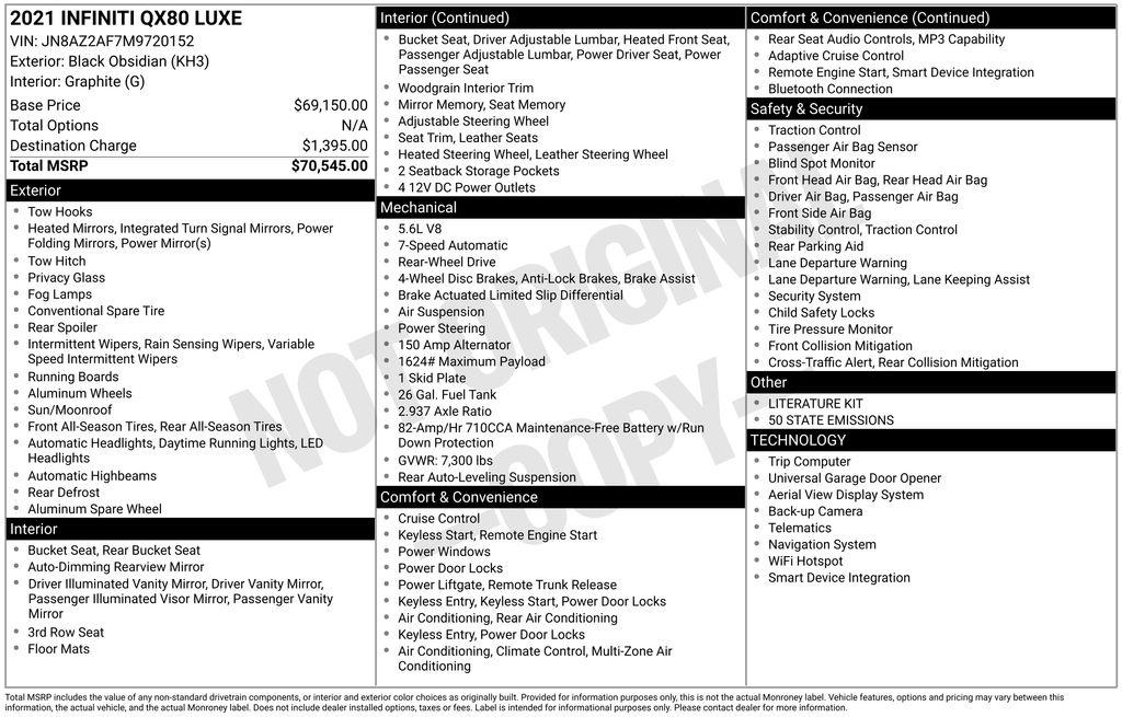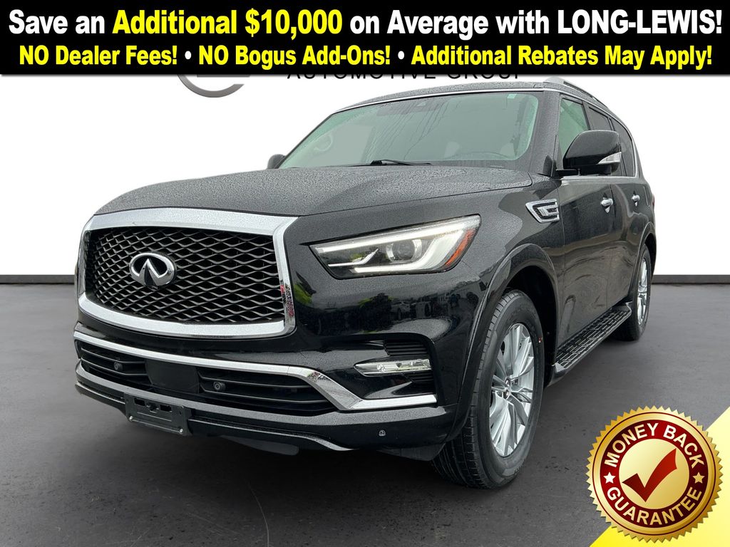 2021 INFINITI QX80 LUXE Black Obsidian LUXE RWD 7-Speed Automatic 5.6L V8 13 Speakers, 2.937 Axle Ratio, 3rd row seats: split-bench, 4-Wheel Disc Brakes, ABS brakes, Air Conditioning, Alloy wheels, AM/FM radio: SiriusXM, Anti-whiplash front head restraints, Apple CarPlay/Android Auto, Auto High-beam Headlights, Auto tilt-away steering wheel, Auto-dimming door mirrors, Auto-dimming Rear-View mirror, Auto-leveling suspension, Automatic temperature control, Brake assist, Bumpers: body-color, CD player, Compass, Delay-off headlights, Driver door bin, Driver vanity mirror, Dual front impact airbags, Dual front side impact airbags, DVD-Audio, Electronic Stability Control, Emergency communication system: INFINITI Connection, Four wheel independent suspension, Front anti-roll bar, Front Bucket Seats, Front Center Armrest, Front dual zone A/C, Front fog lights, Front reading lights, Fully automatic headlights, Garage door transmitter: HomeLink, Heated door mirrors, Heated Front Bucket Seats, Heated front seats, Heated steering wheel, Illuminated entry, Leather Shift Knob, Leather steering wheel, Leather-Appointed Seats, Literature Kit, Low tire pressure warning, Memory seat, Navigation system: INFINITI InTouch Navigation, Occupant sensing airbag, Outside temperature display, Overhead airbag, Overhead console, Panic alarm, Passenger door bin, Passenger vanity mirror, Power door mirrors, Power driver seat, Power Liftgate, Power moonroof, Power passenger seat, Power steering, Power windows, Radio data system, Radio: Bose Audio System w/13 Speakers, Rain sensing wipers, Rear air conditioning, Rear anti-roll bar, Rear audio controls, Rear reading lights, Rear seat center armrest, Rear window defroster, Rear window wiper, Reclining 3rd row seat, Remote keyless entry, Security system, Speed control, Speed-sensing steering, Split folding rear seat, Spoiler, Steering wheel memory, Steering wheel mounted audio controls, Tachometer, Telescoping steering wheel, Tilt steering wheel, Traction control, Trip computer, Turn signal indicator mirrors, Variably intermittent wipers, Voltmeter, Wheels: 20" x 8.0" Aluminum-Alloy.