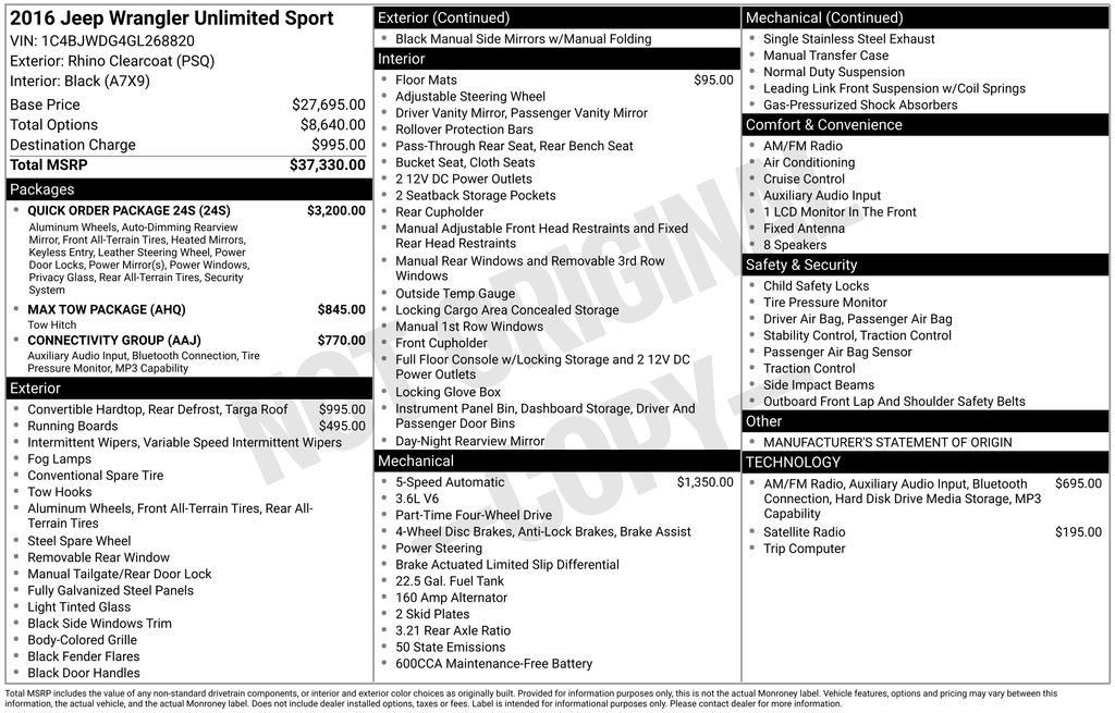 2016 Jeep Wrangler Unlimited Sport Rhino Clearcoat Unlimited Sport 4WD 5-Speed Automatic 3.6L V6 24V VVT 1-Yr SiriusXM Radio Service, 16" x 7.0" Luxury Styled Steel Wheels, 17" x 7.5" Aluminum Wheels, 4-Wheel Disc Brakes, 8 Speakers, ABS brakes, Air Conditioning, AM/FM radio, Audio Jack Input for Mobile Devices, Auto-Dimming Mirror w/Reading Lamp, Black 3-Piece Hard Top, Brake assist, CD player, Chrome/Leather Wrapped Shift Knob, Class II Receiver Hitch, Cloth Seats w/Adjustable Head Restraints, Compass, Connectivity Group, Deep Tint Sunscreen Windows, Delete Sunrider Soft Top, Driver door bin, Driver vanity mirror, Dual front impact airbags, Electronic Stability Control, Freedom Panel Storage Bag, Front 1-Touch Down Power Windows, Front anti-roll bar, Front Bucket Seats, Front Center Armrest w/Storage, Front fog lights, Integrated roll-over protection, Leather Wrapped Steering Wheel, Low tire pressure warning, Manufacturer's Statement of Origin, Max Tow Package, MOPAR Slush Mats, Normal Duty Suspension, Occupant sensing airbag, Outside temperature display, Passenger door bin, Passenger vanity mirror, Power Convenience Group, Power Heated Mirrors, Power Locks, Power steering, Quick Order Package 24S, Radio: 130, Radio: 430, Rear anti-roll bar, Rear Window Defroster, Rear Window Wiper/Washer, Remote Keyless Entry, Remote USB Port, Security Alarm, SIRIUS Satellite Radio, Speed control, Split folding rear seat, Steering wheel mounted audio controls, Sunrider Soft Top, Tachometer, Tilt steering wheel, Tinted Rear Quarter & Liftgate Windows, Tire Pressure Monitoring Display, Traction control, Trailer Tow w/4-Pin Connector Wiring, Trip computer, Tubular Side Steps, Uconnect Voice Command w/Bluetooth, Variably intermittent wipers, Vehicle Information Center.