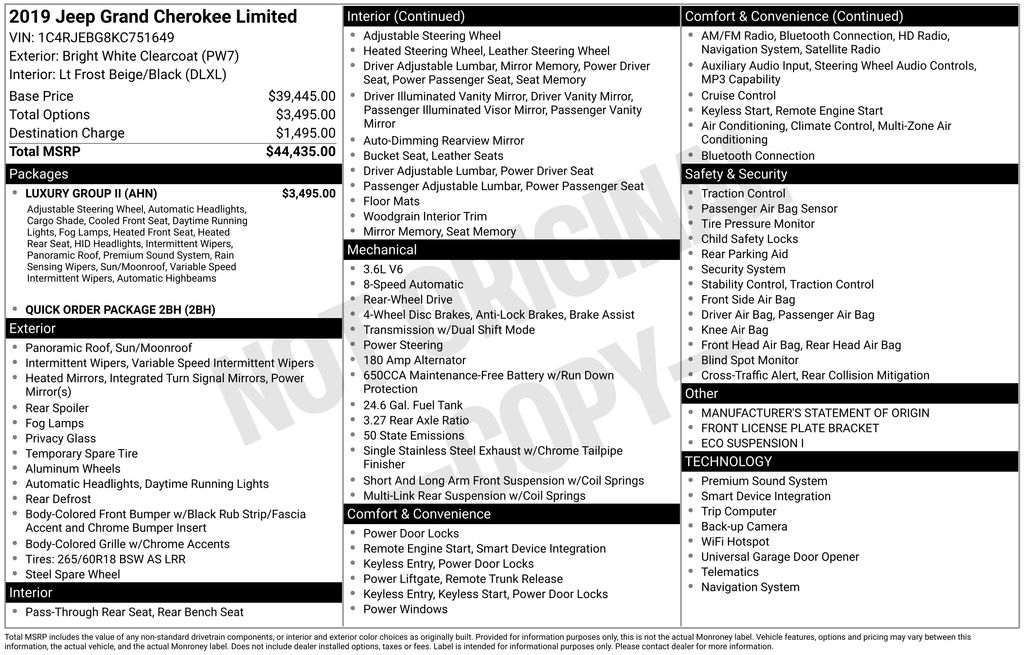 2019 Jeep Grand Cherokee Limited **Here at Long-Lewis we believe in being transparent. We have no Doc fees, or any other hidden fees. We are a one price store and give our best price up front and they are clearly marked on all our inventory.** Bright White Clearcoat RWD 8-Speed Automatic 3.6L V6 24V VVT