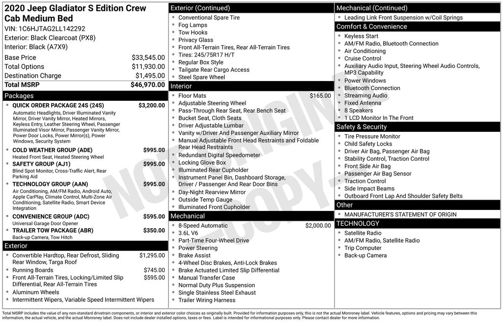 2020 Jeep Gladiator Sport **Here at Long-Lewis we believe in being transparent. We have no Doc fees, or any other hidden fees. We are a one price store and give our best price up front and they are clearly marked on all our inventory.** Black Clearcoat 4WD 8-Speed Automatic 3.6L V6 24V VVT