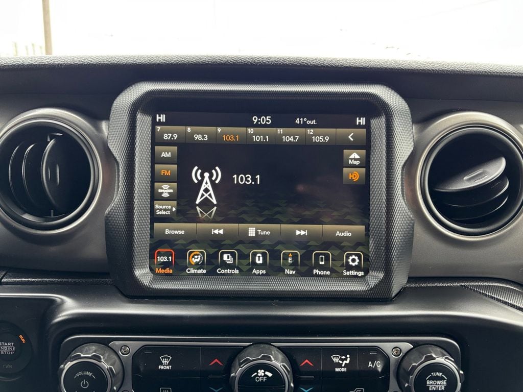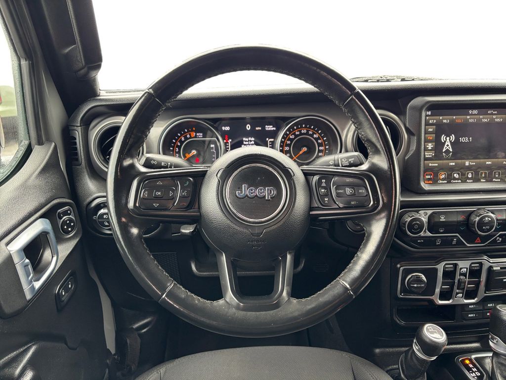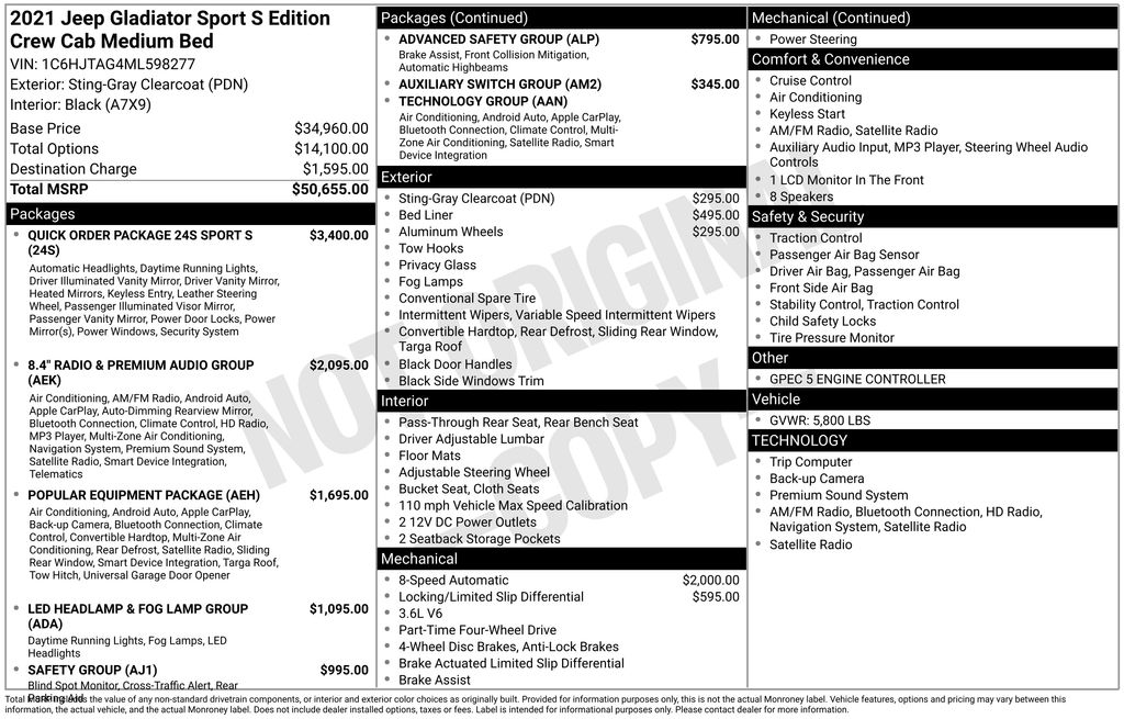 2021 Jeep Gladiator Sport Sting-Gray Clearcoat Sport 4WD 8-Speed Automatic 3.6L V6 24V VVT 1-Year SiriusXM Guardian Trial, 110 mph Vehicle Max Speed Calibration, 115V Auxiliary Power Outlet, 220 Amp Alternator, 240 Amp Alternator, 3.73 Rear Axle Ratio, 4-Wheel Disc Brakes, 400W Inverter, 5-Year SiriusXM Traffic Service, 5-Year SiriusXM Travel Link Service, 700 Amp Maintenance Free Battery, 8 Speakers, 8.4" Radio & Premium Audio Group, 8.4" Touchscreen Display, ABS brakes, Advanced Brake Assist, Advanced Safety Group, Air Conditioning, Air Conditioning w/Auto Temperature Control, Alpine Premium Audio System, AM/FM radio, Anti-Lock 4-Wheel Disc Heavy Duty Brakes, Anti-Spin Differential Rear Axle, Apple CarPlay, Auto High Beam Headlamp Control, Auto-Dimming Rear-View Mirror, Automatic Headlamps, Auxiliary Switch Group, Auxiliary Switches, Black 3-Piece Hard Top, Blind Spot & Cross Path Detection, Body Color Fender Flares (2-Piece), Brake assist, Class IV Hitch Receiver, Cloth Low-Back Bucket Seats, Compass, Console Bin Task Light, Convenience Group, Daytime Running Lamp System, Daytime Running Lamps LED Accents, Deep Tint Sunscreen Windows, Delay-off headlights, Driver door bin, Driver vanity mirror, Dual front impact airbags, Dual front side impact airbags, Electronic Stability Control, Emergency/Assistance Call, Enhanced Adaptive Cruise Control, For Details, Visit DriveUconnect.com, For More Info, Call 800-643-2112, Front 1-Touch Down Power Windows, Front anti-roll bar, Front Bucket Seats, Front Center Armrest w/Storage, Front fog lights, Front LED Fog Lamps, Front reading lights, Full Speed Forward Collision Warning Plus, Google Android Auto, GPEC 5 Engine Controller, GPS Antenna Input, GPS Navigation, HD Radio, Heavy-Duty Engine Cooling, Integrated Center Stack Radio, Integrated roll-over protection, Leather Wrapped Steering Wheel, LED Headlamp & Fog Lamp Group, LED Premium Reflector Headlamps, LED Taillamps, Low tire pressure warning, Media Hub w/2 Charge Only USBs, Molded in Color Bumper w/Accent Color, MOPAR Spray In Bedliner, Normal Duty Plus Suspension, Normal Duty Suspension, Occupant sensing airbag, Off-Road Info Pages, Outside temperature display, ParkSense Rear Park Assist System, ParkView Rear Back-Up Camera, Passenger door bin, Passenger vanity mirror, Popular Equipment Package, Power Heated Mirrors, Power steering, Power Tailgate Lock, Quick Order Package 24S Sport S, Radio data system, Radio: Uconnect 3 w/5" Display, Radio: Uconnect 4C Nav w/8.4" Display, Rear anti-roll bar, Rear reading lights, Remote Keyless Entry, Safety Group, Security Alarm, SiriusXM Radio Service, SiriusXM Satellite Radio, SiriusXM Traffic Plus, SiriusXM Travel Link, Speed control, Speed Sensitive Power Locks, Split folding rear seat, Sport S, Steering wheel mounted audio controls, Sun Visors w/Illuminated Vanity Mirrors, Tachometer, Telescoping steering wheel, Tilt steering wheel, Traction control, Trailer Hitch Zoom, Trailer Tow Package, Trip computer, USB Host Flip, Variably intermittent wipers, Wheels: 17" x 7.5" Black Steel Styled, Wheels: 17" x 7.5" Gloss Black Aluminum.