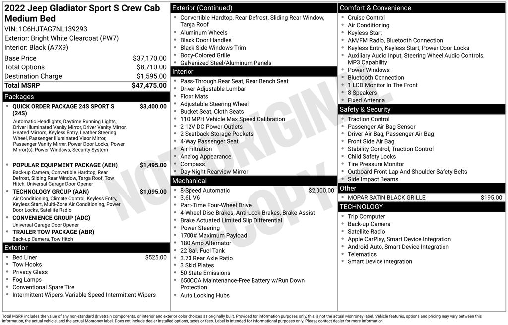 2022 Jeep Gladiator Sport Bright White Clearcoat Sport 4WD 8-Speed Automatic 3.6L V6 24V VVT 110 MPH Vehicle Max Speed Calibration, 2-Door Passive Entry, Front Door Locks, 3.73 Rear Axle Ratio, 4-Wheel Disc Brakes, 8 Speakers, ABS brakes, Air Conditioning, AM/FM radio, Apple CarPlay, Apple CarPlay/Android Auto, Black 3-Piece Hard Top, Brake assist, Cloth Low-Back Bucket Seats, Compass, Convenience Group, Daytime Running Lamp System, Delay-off headlights, Driver door bin, Driver vanity mirror, Dual front impact airbags, Dual front side impact airbags, Electronic Stability Control, Emergency communication system: SiriusXM Guardian, Front anti-roll bar, Front Bucket Seats, Front Center Armrest w/Storage, Front fog lights, Front reading lights, Google Android Auto, GPS Antenna Input, Integrated Center Stack Radio, Integrated roll-over protection, Integrated Voice Command w/Bluetooth, Low tire pressure warning, MOPAR Satin Black Grille, MOPAR Spray In Bedliner, Normal Duty Suspension, Occupant sensing airbag, Outside temperature display, ParkView Rear Back-Up Camera, Passenger door bin, Passenger vanity mirror, Popular Equipment Package, Power steering, Quick Order Package 24S Sport S, Radio data system, Radio: Uconnect 4 w/7" Display, Rear anti-roll bar, Rear reading lights, Rear Window Defroster, SiriusXM Satellite Radio, Speed control, Split folding rear seat, Steering wheel mounted audio controls, Tachometer, Technology Group, Telescoping steering wheel, Tilt steering wheel, Traction control, Trailer Tow Package, Trip computer, USB Host Flip, Variably intermittent wipers, Wheels: 17" x 7.5" Black Steel Styled, Wheels: 17" x 7.5" Tech Silver Aluminum.