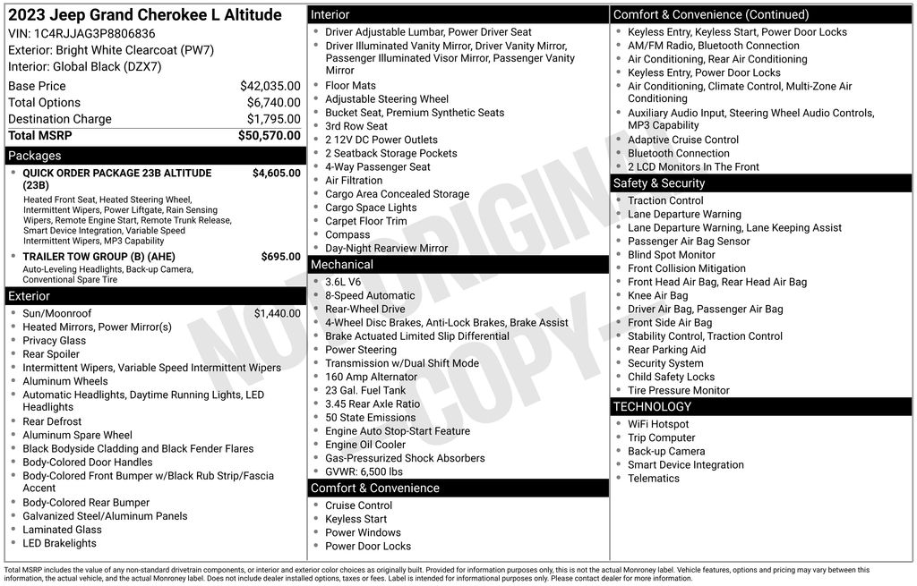 Here are the key details, strengths, and things to watch for the 2023 Grand Cherokee L Altitude with the 3.6 L V6 (the Pentastar engine):Engine: 3.6 L V6 (naturally aspirated) producing around 293 hp and about 260 lb-ft of torque. Seating: The L version means the extended wheelbase 3-row model (so third row is available).Fuel economy (US estimate): ~19 mpg city / 26 mpg highway (combined ~21 mpg) for version with the 3.6L V6. The 3-row cabin gives more flexibility for families or groups. If you need 7 seats (or 6/7 depending configuration), this is a strong point.