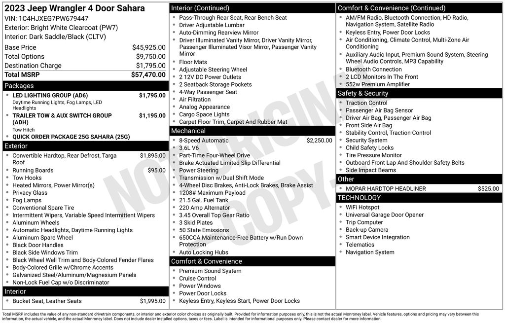 2023 Jeep Wrangler Sahara Bright White Clearcoat Sahara 4WD 8-Speed Automatic 3.6L V6 24V VVT 240 Amp Alternator, 3.45 Overall Top Gear Ratio, 4-Wheel Disc Brakes, 7 & 4 Pin Wiring Harness, 700 Amp Maintenance Free Battery, 9 Speakers, ABS brakes, Air Conditioning, Alloy wheels, AM/FM radio: SiriusXM, Apple CarPlay/Android Auto, Auto-dimming Rear-View mirror, Automatic temperature control, Aux Battery, Auxiliary Switches, Black 3-Piece Hard Top, Brake assist, Class II Receiver Hitch, Cloth Low-Back Bucket Seats, Compass, Daytime Running Lamps LED Accents, Delay-off headlights, Driver door bin, Driver vanity mirror, Dual front impact airbags, Dual front side impact airbags, Electronic Stability Control, Emergency communication system: SiriusXM Guardian, Freedom Panel Storage Bag, Front anti-roll bar, Front Bucket Seats, Front Center Armrest w/Storage, Front dual zone A/C, Front fog lights, Front LED Fog Lamps, Front reading lights, Fully automatic headlights, Garage door transmitter, Heated door mirrors, Heavy Duty Suspension w/Gas Shocks, Illuminated entry, Integrated roll-over protection, LED Lighting Group, LED Premium Reflector Headlamps, LED Taillamps, Low tire pressure warning, MOPAR Hardtop Headliner, Navigation System, No Soft Top, Non-Lock Fuel Cap w/o Discriminator, Occupant sensing airbag, Outside temperature display, Panic alarm, ParkView Rear Back-Up Camera, Passenger door bin, Passenger vanity mirror, Power door mirrors, Power steering, Power windows, Quick Order Package 25G Sahara, Radio data system, Radio: Uconnect 4C Nav w/8.4" Display, Rear anti-roll bar, Rear reading lights, Rear Window Defroster, Rear Window Wiper/Washer, Remote keyless entry, Security system, Side Steps, Speed control, Split folding rear seat, Steering wheel mounted audio controls, Stop-Start Dual Battery System, Tachometer, Telescoping steering wheel, Tilt steering wheel, Traction control, Trailer Tow & Aux Switch Group, Trip computer, Variably intermittent wipers, Voltmeter, Wheels: 18" x 7.5" Machined w/Gray Spokes.