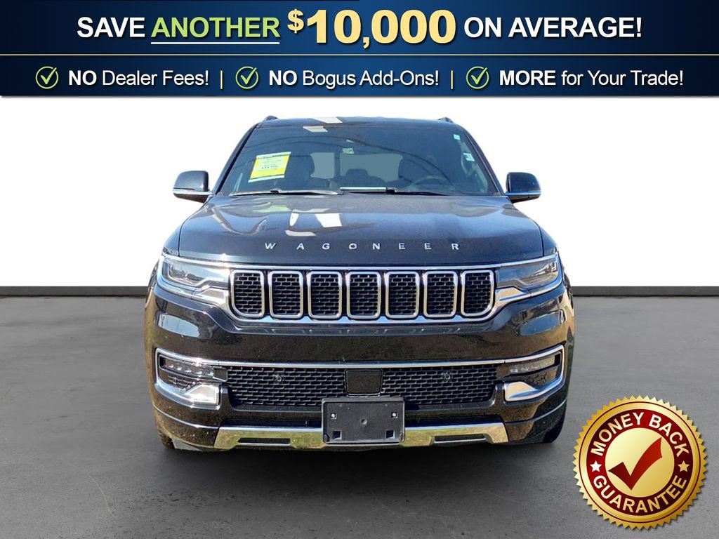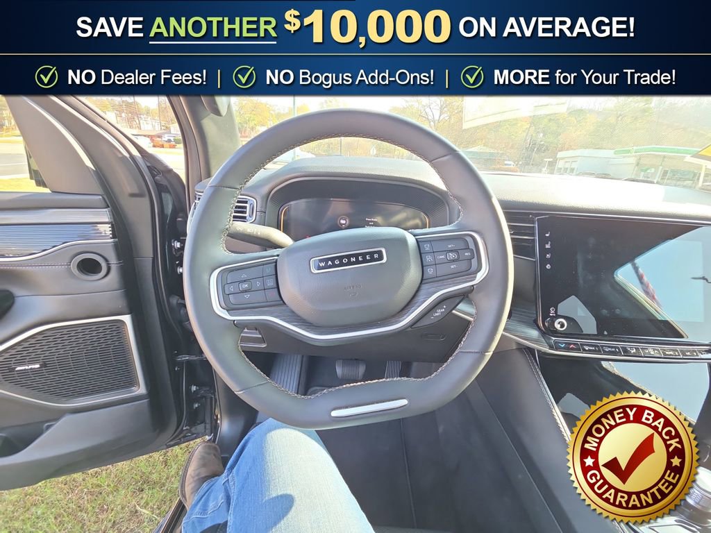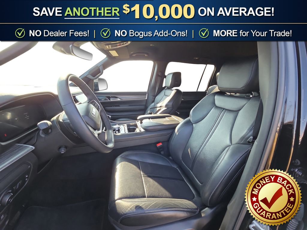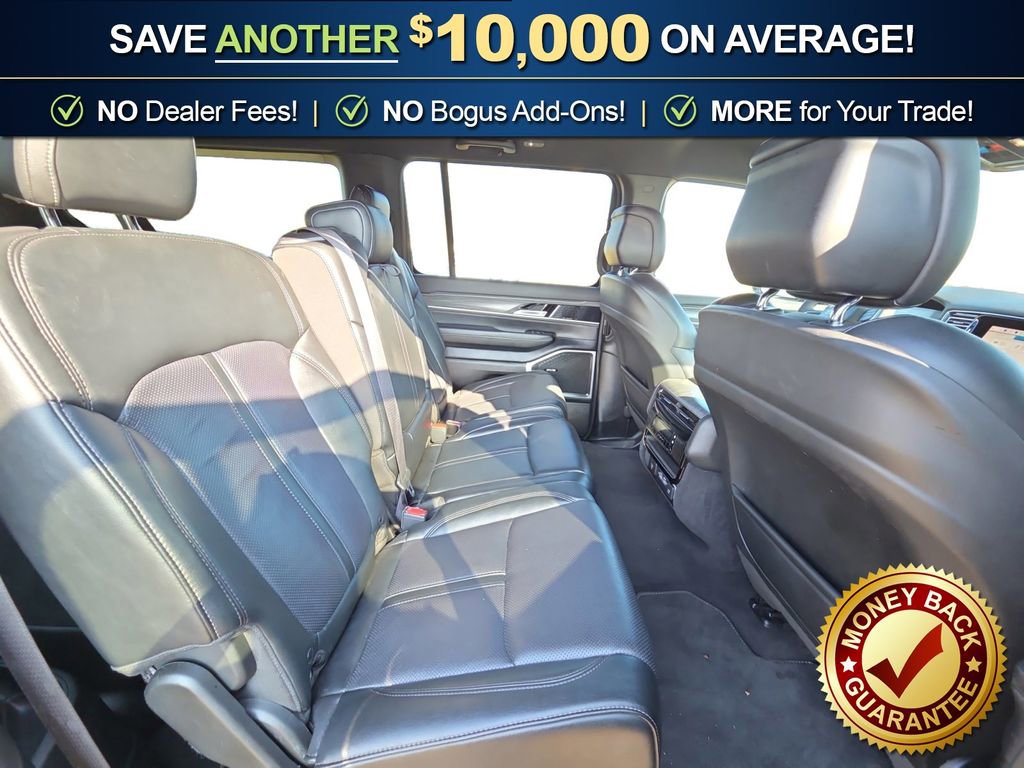 10 Speakers, 3.55 Rear Axle Ratio, 3rd row seats: bench, 4-Wheel Disc Brakes, 8-Passenger Seating, ABS brakes, Adjustable pedals, Air Conditioning, Alloy wheels, AM/FM radio: SiriusXM with 360L, Anti-whiplash front head restraints, Apple CarPlay/Android Auto, Audio memory, Auto High-beam Headlights, Auto-dimming door mirrors, Auto-dimming Rear-View mirror, Auto-leveling suspension, Automatic temperature control, Brake assist, Bumpers: body-color, Compass, Delay-off headlights, Driver door bin, Driver vanity mirror, Driver's Seat Mounted Armrest, Dual front impact airbags, Dual front side impact airbags, Electronic Stability Control, Emergency communication system: Wagoneer Connect, Exterior Parking Camera Rear, Four wheel independent suspension, Front anti-roll bar, Front Bucket Seats, Front Center Armrest w/Storage, Front dual zone A/C, Front fog lights, Front reading lights, Full Length Floor Console, Fully automatic headlights, Garage door transmitter, Genuine wood console insert, Genuine wood dashboard insert, Genuine wood door panel insert, Heads-Up Display, Heated door mirrors, Heated front seats, Heated rear seats, Heated steering wheel, Illuminated entry, Knee airbag, Leather Trimmed Bucket Seats, Low tire pressure warning, Memory seat, Navigation System, Normal Duty Suspension, Occupant sensing airbag, Outside temperature display, Overhead airbag, Overhead console, Panic alarm, Passenger door bin, Passenger seat mounted armrest, Passenger vanity mirror, Pedal memory, Power adjustable front head restraints, Power door mirrors, Power driver seat, Power Liftgate, Power passenger seat, Power steering, Power windows, Preferred Equipment Group (DISC), Quadra-Lift Air Suspension, Quick Order Package 25N, Radio data system, Radio: Uconnect 5 Nav w/10.1 Display, Rain sensing wipers, Rear air conditioning, Rear anti-roll bar, Rear reading lights, Rear seat center armrest, Rear window defroster, Rear window wiper, Reclining 3rd row seat, Remote keyless entry, Security system, Semi Active Damping, Speed control, Speed-sensing steering, Speed-Sensitive Wipers, Split folding rear seat, Steering wheel memory, Steering wheel mounted audio controls, Tachometer, Telescoping steering wheel, Tilt steering wheel, Traction control, Trip computer, Turn signal indicator mirrors, Variably intermittent wipers, Ventilated front seats, Voltmeter, Wheels: 20 x 9.0 Aluminum (DISC).