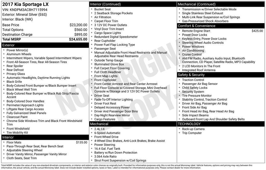 2017 Kia Sportage LX Mineral Silver LX FWD 6-Speed Automatic 2.4L I4 DGI DOHC 16V 17" Alloy Wheels, 3.064 Axle Ratio, 4-Wheel Disc Brakes, 6 Speakers, ABS brakes, Air Conditioning, Alloy wheels, AM/FM radio: SiriusXM, Brake assist, Bumpers: body-color, Carpet Floor Mats, CD player, Cloth Seat Trim, Delay-off headlights, Driver door bin, Driver vanity mirror, Dual front impact airbags, Dual front side impact airbags, Electronic Stability Control, Exterior Parking Camera Rear, Four wheel independent suspension, Front anti-roll bar, Front Bucket Seats, Front Center Armrest, Front reading lights, Fully automatic headlights, Illuminated entry, Low tire pressure warning, Occupant sensing airbag, Outside temperature display, Overhead airbag, Overhead console, Panic alarm, Passenger door bin, Passenger vanity mirror, Power door mirrors, Power steering, Power windows, Radio: AM/FM/CD/MP3/SiriusXM, Radio: AM/FM/SiriusXM, Rear anti-roll bar, Rear seat center armrest, Rear window defroster, Rear window wiper, Remote keyless entry, Remote Start (Key Start), Security system, Speed control, Speed-sensing steering, Split folding rear seat, Spoiler, Steering wheel mounted audio controls, Tachometer, Telescoping steering wheel, Tilt steering wheel, Traction control, Trip computer, Variably intermittent wipers.