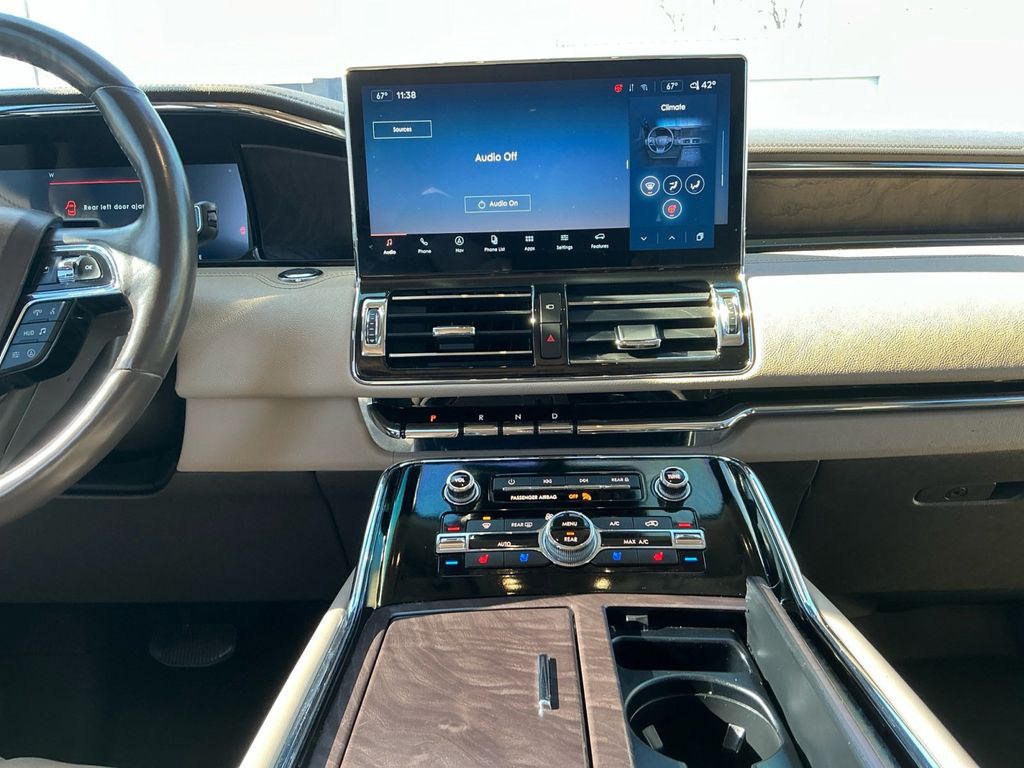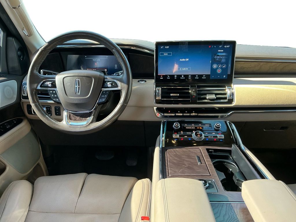 2022 Lincoln Navigator Reserve Infinite Black Metallic Clearcoat Reserve 4WD 10-Speed Automatic V6 4WD, Sandstone Leather, 14 Speakers, 2nd Row Heated/Ventilated 40/Console/40 Seat, 3.73 Axle Ratio, 3rd row seats: split-bench, 4-Wheel Disc Brakes, ABS brakes, Adaptive suspension, Adjustable pedals, Air Conditioning, Alloy wheels, AM/FM radio: SiriusXM with 360L, Audio memory, Auto High-beam Headlights, Auto Start-Stop Technology, Auto tilt-away steering wheel, Auto-dimming door mirrors, Auto-dimming Rear-View mirror, Auto-leveling suspension, Automatic temperature control, Body-Color Exterior Mirror Finish, Bodyside moldings, Brake assist, Bumpers: body-color, Compass, Delay-off headlights, Driver door bin, Driver vanity mirror, Driver's Seat Mounted Armrest, Dual front impact airbags, Dual front side impact airbags, Electronic Stability Control, Emergency communication system: 911 Assist, Equipment Group 201A Reserve I, Exterior Parking Camera Rear, Four wheel independent suspension, Front anti-roll bar, Front Bucket Seats, Front dual zone A/C, Front fog lights, Front reading lights, Fully automatic headlights, Garage door transmitter, Genuine wood dashboard insert, Genuine wood door panel insert, Head restraints memory, Heads-Up Display, Heated door mirrors, Heated front seats, Heated rear seats, Heated steering wheel, HVAC memory, Illuminated 1st & 2nd Row Seat Belts, Illuminated entry, Leather steering wheel, Lincoln Lit Star in Grille, Low tire pressure warning, Luxury Package, Memory seat, Monochromatic Lincoln Badge, Monochromatic Lincoln Grille, Monochromatic Package, Navigation system: Connected Navigation (3-year trial), Occupant sensing airbag, Outside temperature display, Overhead airbag, Overhead console, Panic alarm, Passenger door bin, Passenger seat mounted armrest, Passenger vanity mirror, Pedal memory, Perfect Position Seats (30-Way) w/Active Motion, Power adjustable rear head restraints, Power door mirrors, Power driver seat, Power Liftgate, Power moonroof: Panoramic Vista Roof, Power passenger seat, Power steering, Power windows, Prem Lthr Auto Htd/Ventiltd Perfect Position Seats, Radio data system, Radio: Revel AM/FM/HD/MP3 Audio System, Rain sensing wipers, Rear air conditioning, Rear anti-roll bar, Rear audio controls, Rear reading lights, Rear window defroster, Rear window wiper, Reclining 3rd row seat, Remote keyless entry, Revel Ultima 3D Audio System w/28 Speakers, Security system, SiriusXM w/360L, Speed control, Speed-sensing steering, Speed-Sensitive Wipers, Split folding rear seat, Spoiler, Steering wheel memory, Steering wheel mounted audio controls, SYNC 4 Communications & Entertainment System, Tachometer, Telescoping steering wheel, Tilt steering wheel, Traction control, Trip computer, Turn signal indicator mirrors, Variably intermittent wipers, Ventilated front seats, Ventilated rear seats, Voice-Activated Touchscreen Navigation System, Wheels: 22" Black Aluminum, Wheels: 22" Bright Machined Aluminum, 4WD, Sandstone Leather.