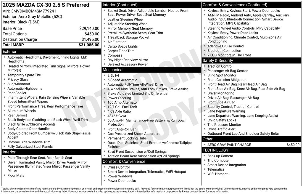 2025 Mazda CX-30 2.5 S Preferred Package Aero Gray Metallic 2.5 S Preferred Package AWD 6-Speed Automatic SKYACTIV® 2.5L 4-Cylinder DOHC 16V 4-Wheel Disc Brakes, 6 Speakers, ABS brakes, Aero Gray Paint Charge, Air Conditioning, Alloy wheels, AM/FM radio, AppLink/Apple CarPlay and Android Auto, Auto High-beam Headlights, Automatic temperature control, Brake assist, Bumpers: body-color, Compass, Delay-off headlights, Driver door bin, Driver vanity mirror, Dual front impact airbags, Dual front side impact airbags, Electronic Stability Control, Emergency communication system: Mazda Connected Services (3-year trial subscription included), Exterior Parking Camera Rear, Front anti-roll bar, Front Bucket Seats, Front Center Armrest, Front dual zone A/C, Front reading lights, Front wheel independent suspension, Fully automatic headlights, Heated door mirrors, Heated Front Bucket Seats, Heated front seats, Illuminated entry, Knee airbag, Leather Shift Knob, Leather steering wheel, Leatherette Seat Trim, Low tire pressure warning, MAZDA CONNECT Infotainment System, Memory seat, Occupant sensing airbag, Outside temperature display, Overhead airbag, Overhead console, Panic alarm, Passenger door bin, Passenger vanity mirror, Power door mirrors, Power driver seat, Power moonroof, Power steering, Power windows, Radio data system, Radio: AM/FM Audio System, Rain sensing wipers, Rear seat center armrest, Rear side impact airbag, Rear window defroster, Rear window wiper, Remote keyless entry, Speed control, Speed-sensing steering, Split folding rear seat, Spoiler, Steering wheel mounted audio controls, Tachometer, Telescoping steering wheel, Tilt steering wheel, Traction control, Trip computer, Turn signal indicator mirrors, Variably intermittent wipers, Wheels: 18" x 7J Aluminum Alloy.